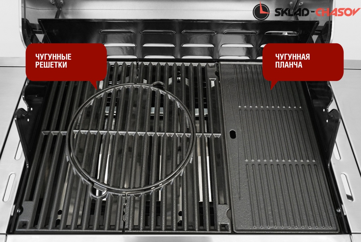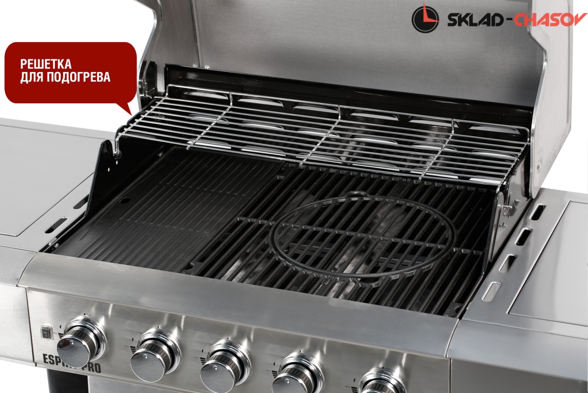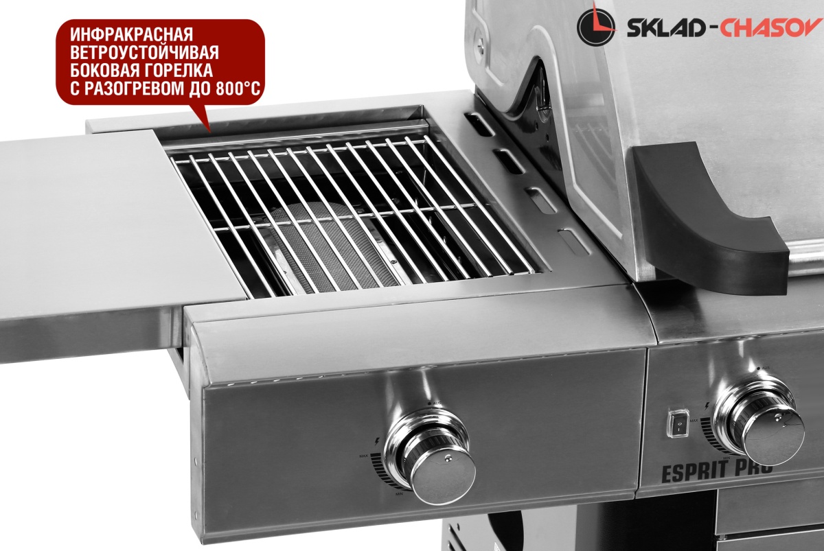 Ярким преимуществом модели Esprit Pro является наличие 5 горелок, которые обеспечивают равномерное распределение тепла. Инфракрасная ветроустойчивая левая боковая горелка разогревается до 800°C и гарантирует идеальную прожарку мяса в любую погоду. Правая мощная боковая горелка прекрасно подойдет для приготовления фирменных соусов. Гриль укомплектован чугунными решетками для приготовления, чугунной планчей и решеткой для подогрева.