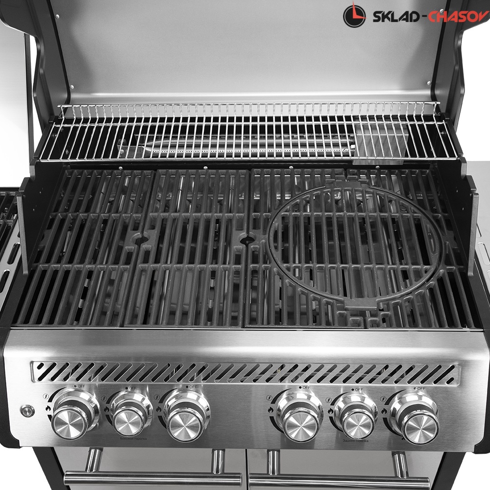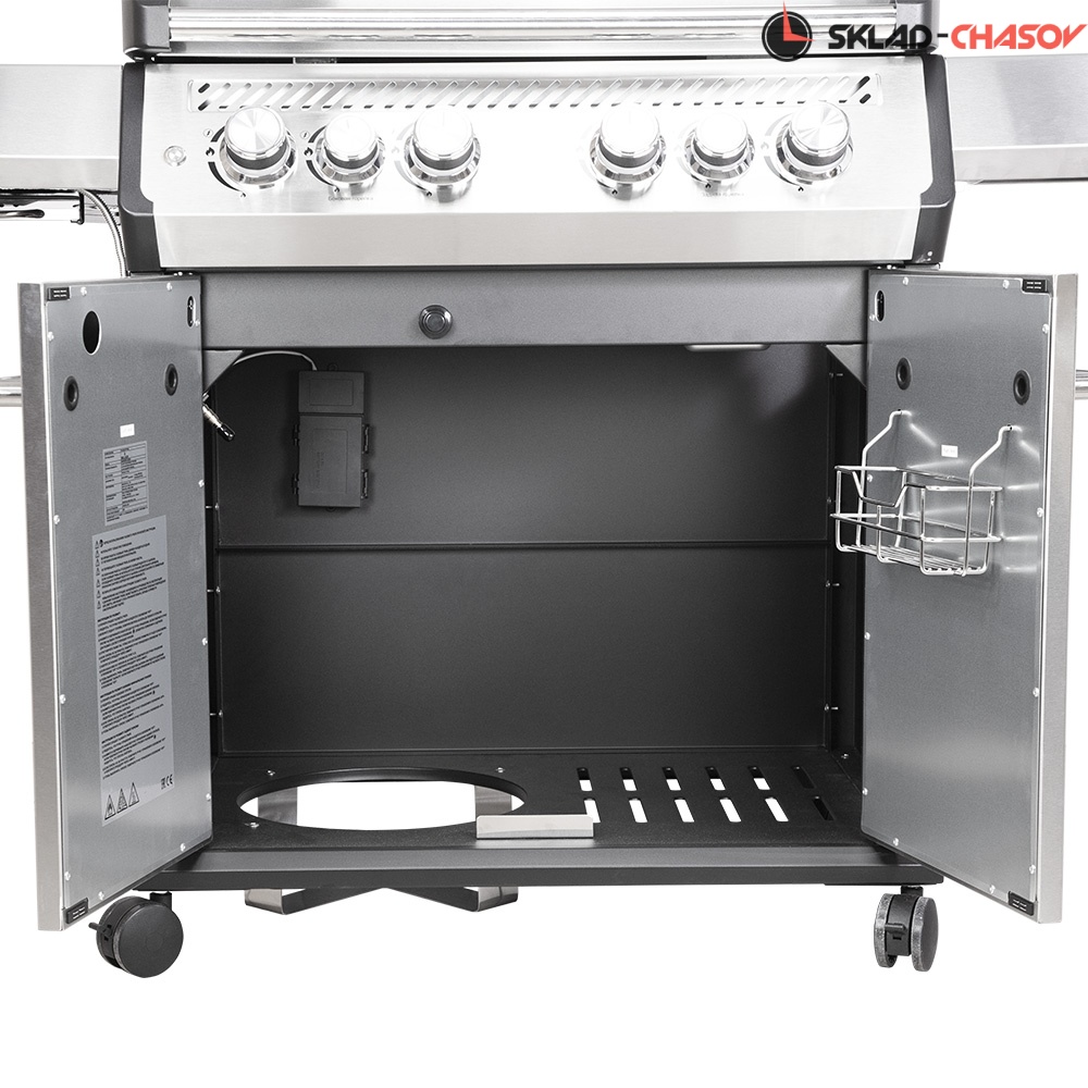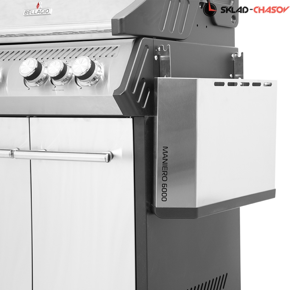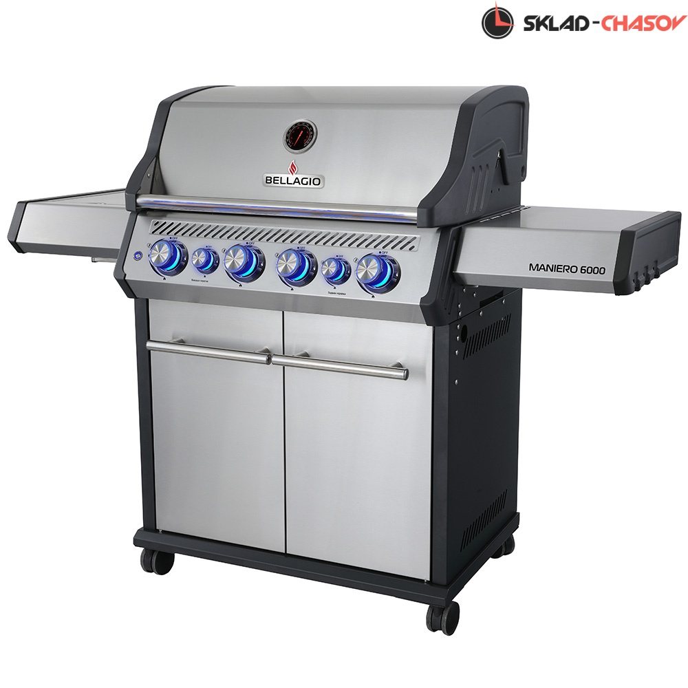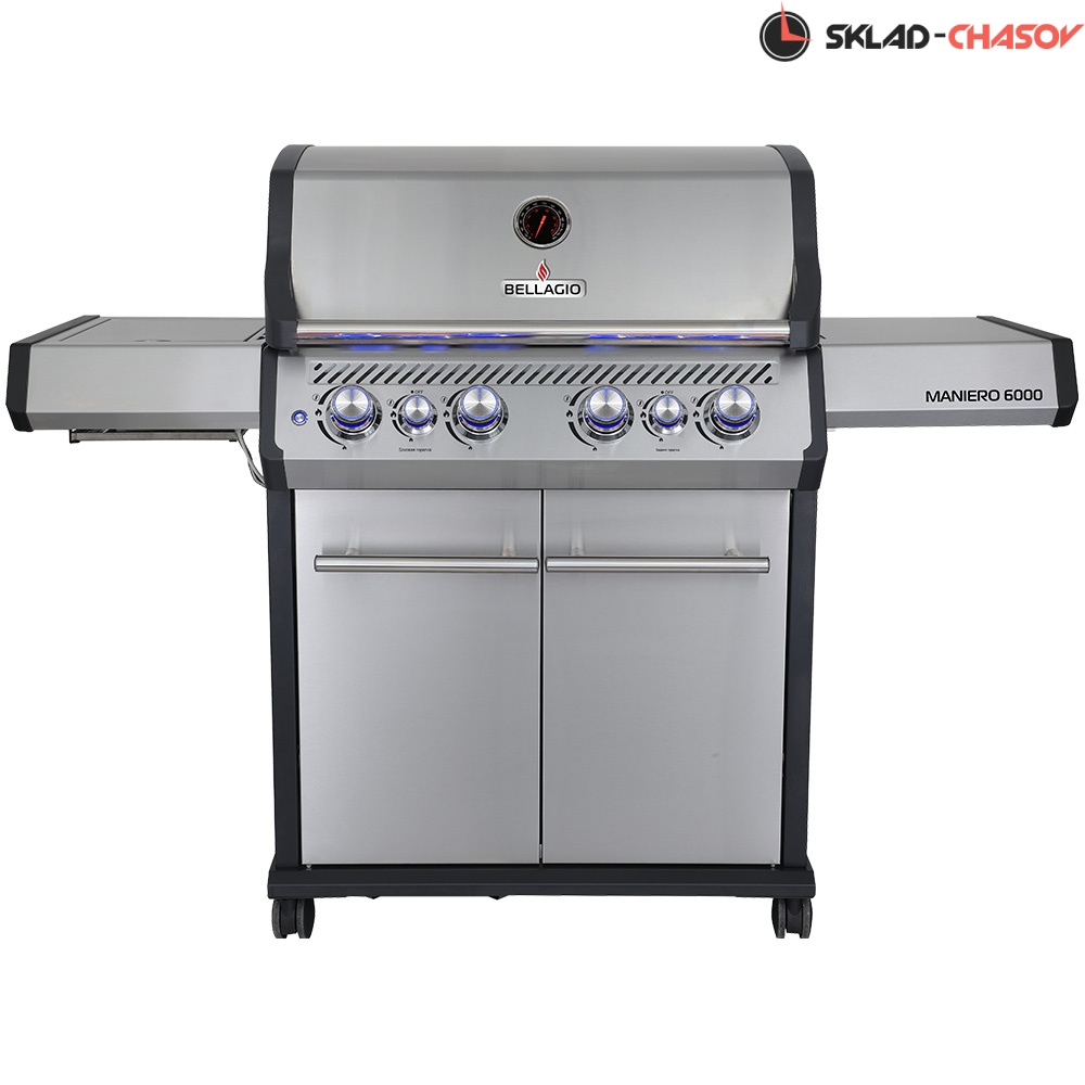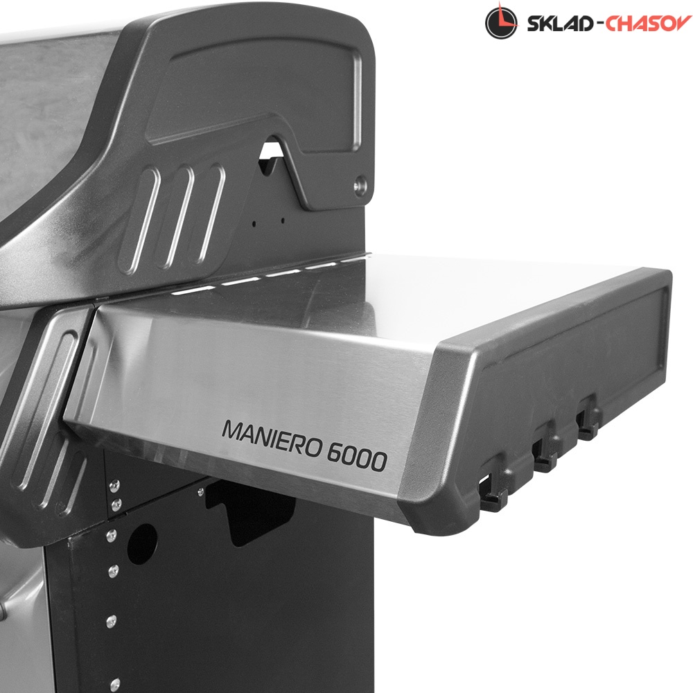 Maniero 6000 – газовый гриль с 4 основными горелками, 1 задней конфоркой и 1 инфракрасной горелкой, встроенной в боковой столик конфоркой. Данная модель отличается просторной жарочной поверхностью, равномерным нагревом и профессиональным набором функций.