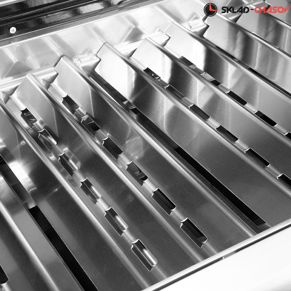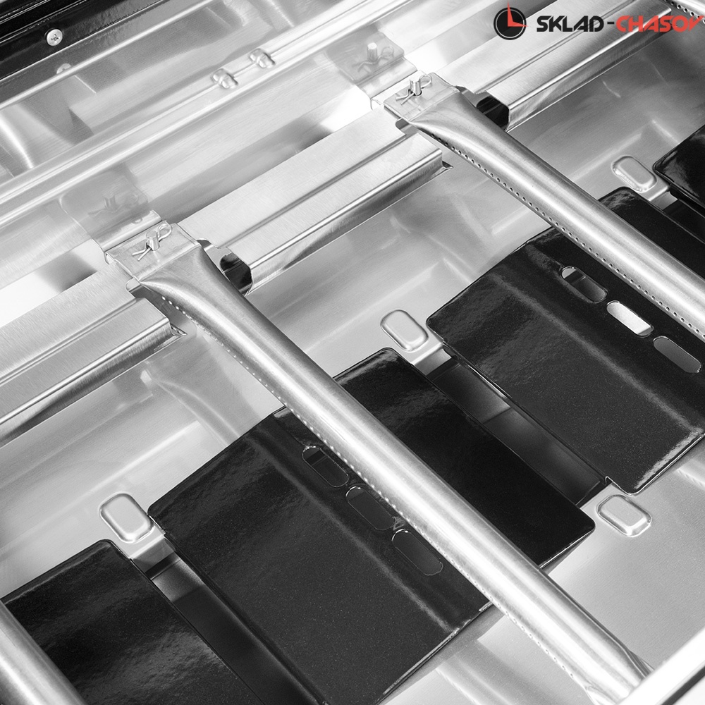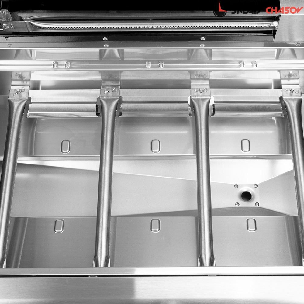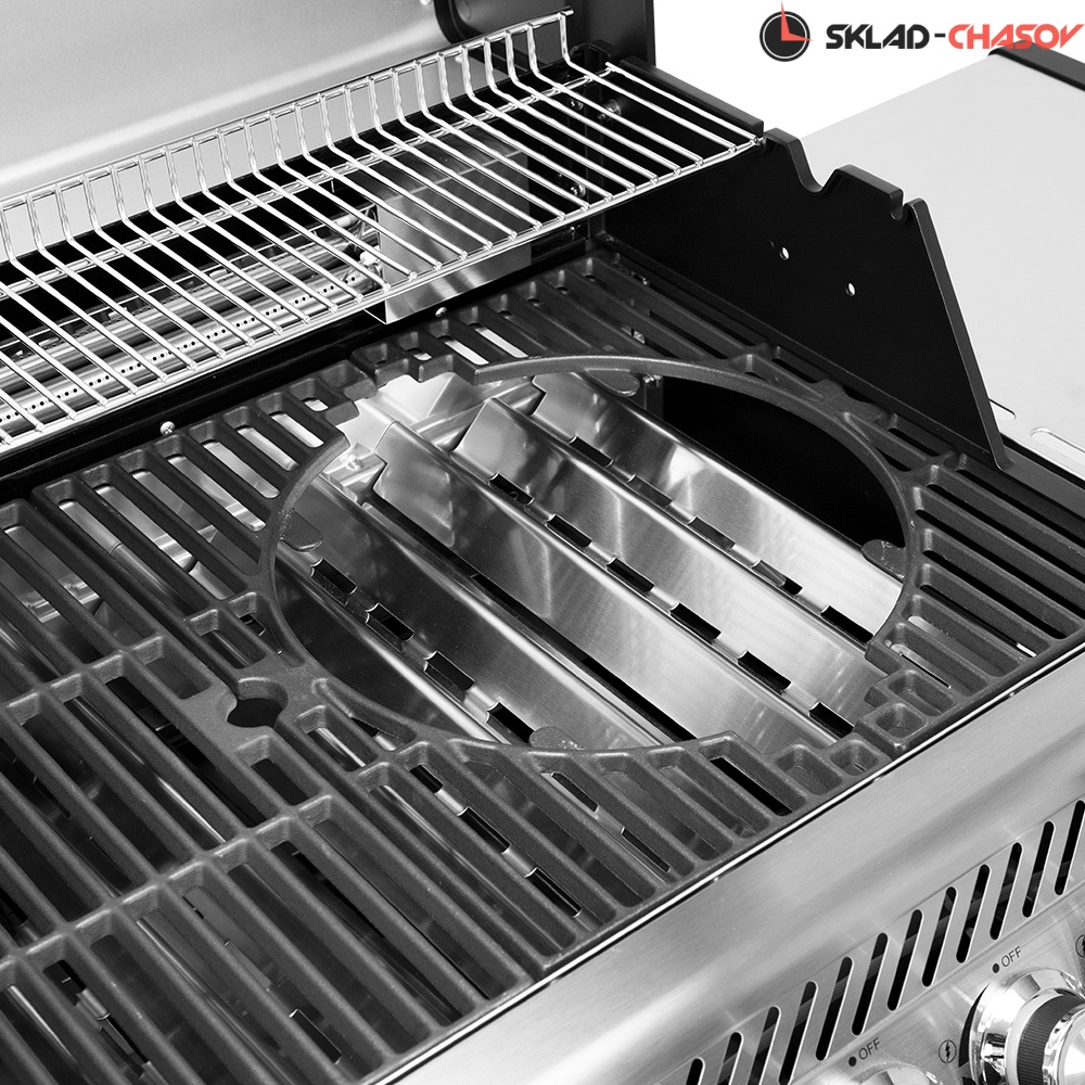 • Каждую горелку защищают рассекатели пламени. Они препятствуют возникновению вспышек пламени, обеспечивают равномерное нагревание и придают блюдам неповторимый аромат барбекю.
