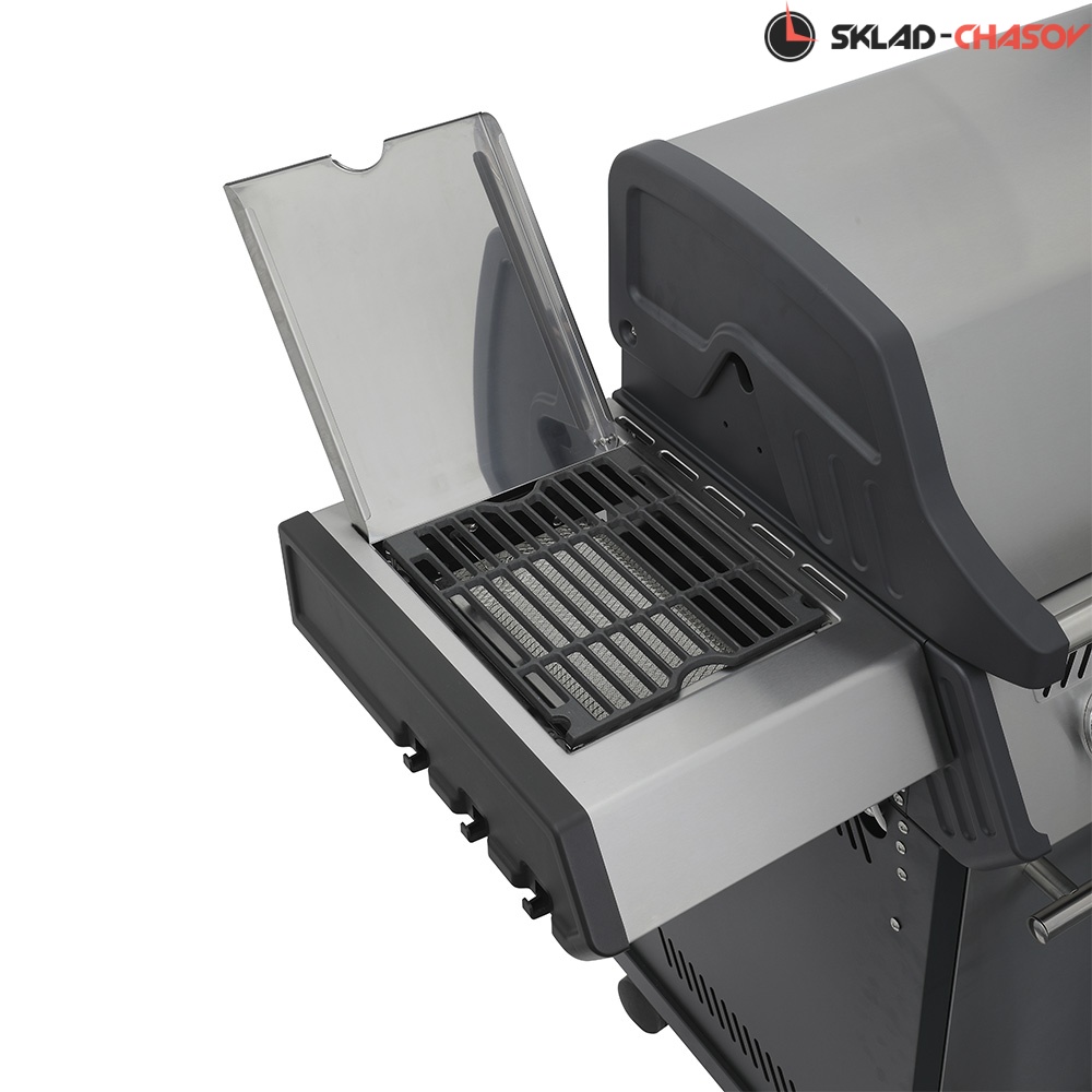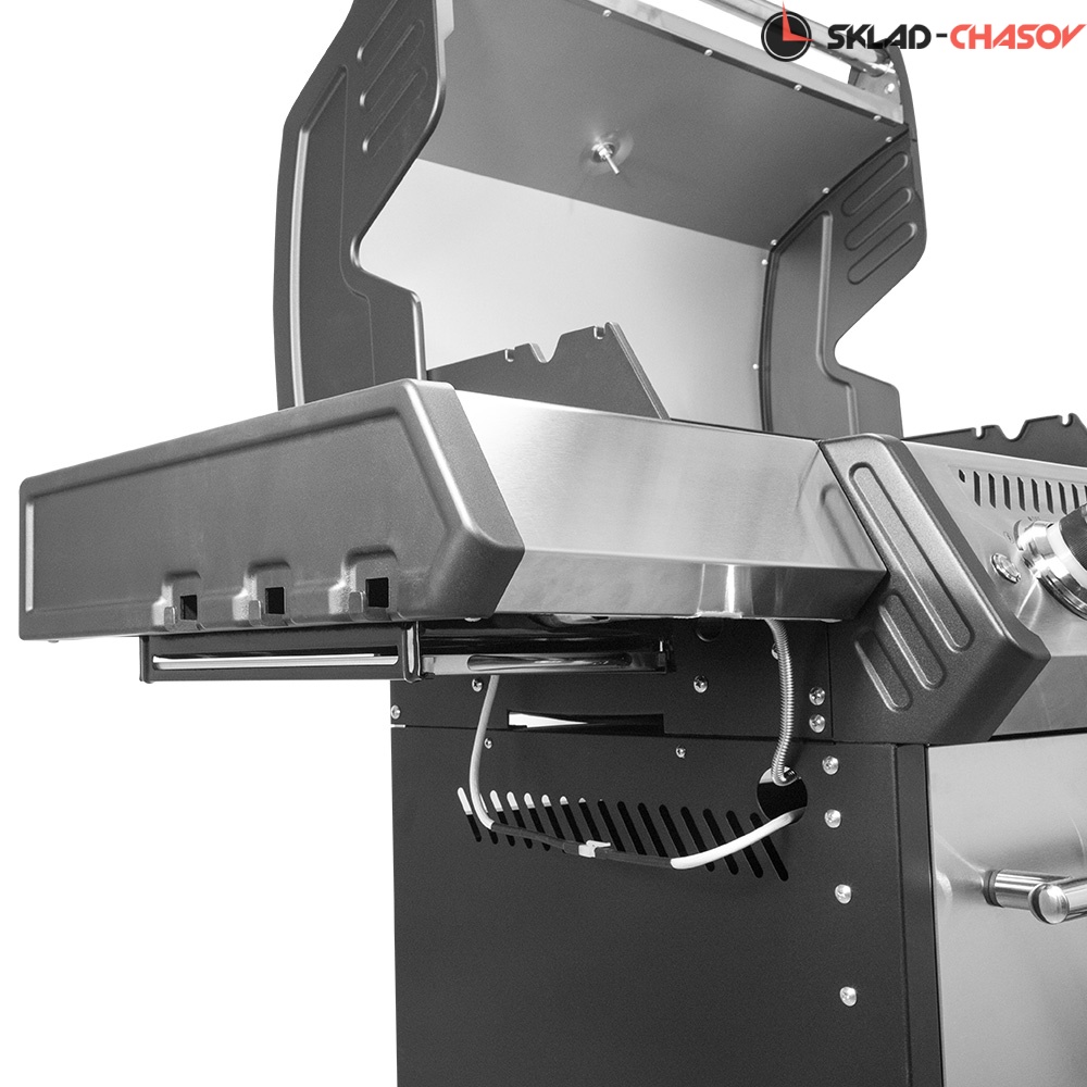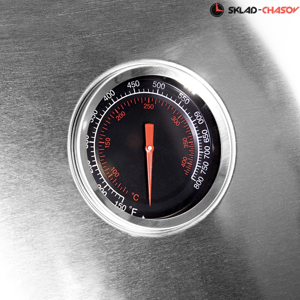 Крышка гриля снабжена встроенным термометром. Он позволяет отслеживать температуру в гриле и реже открывать крышку, чтобы сохранять жар. Также термометр подскажет, когда нужно уменьшить мощность горения конфорок, чтобы продукты не подгорели.