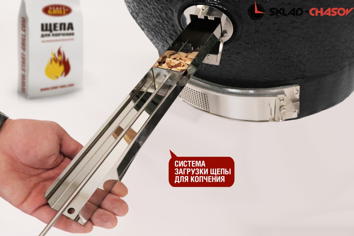 Start Grill SG 24 CFG CHEF PRO имеет в своем арсенале удобную и эффективную систему подачи щепы CFG. Эта система представляет собой открывающийся отсек в корпусе гриля, направляющий лоток и толкатель. Теперь нет необходимости убирать продукты с решетки для приготовления, снимать саму решетку, чтобы загрузить дополнительную порцию щепы. Система CFG позволяет добавить щепу за считанные секунды, не открывая крышки гриля.