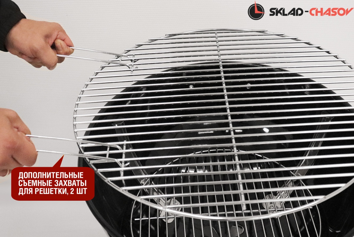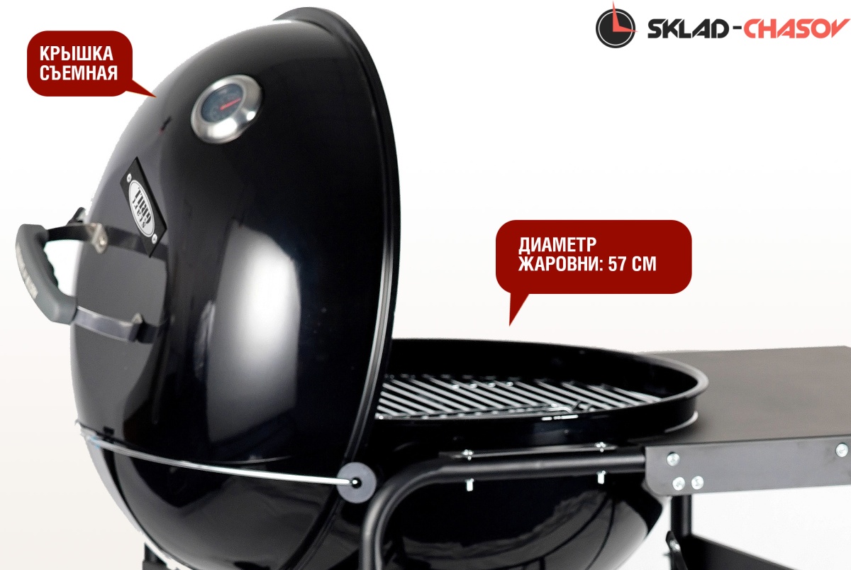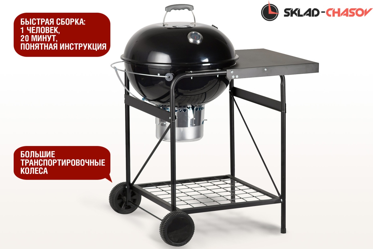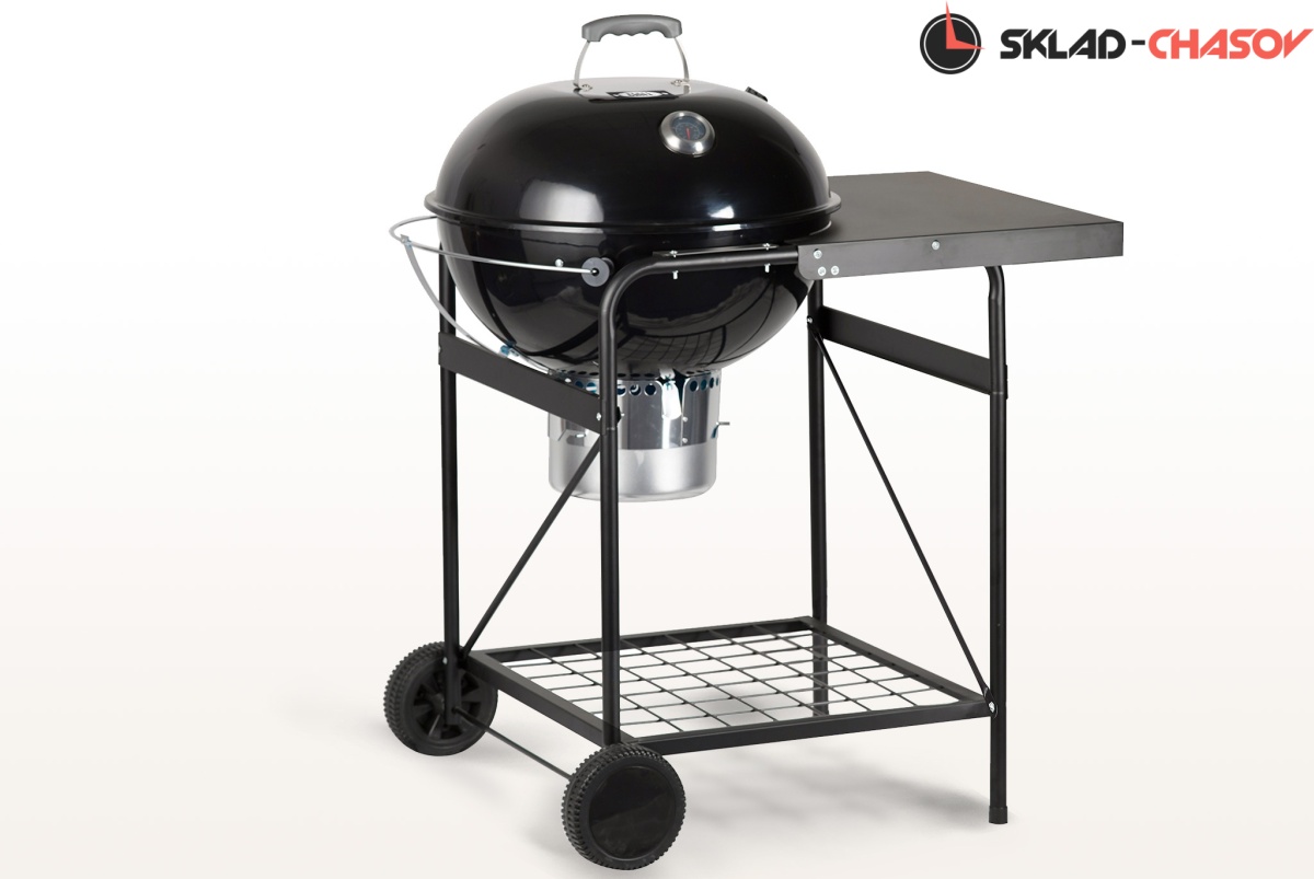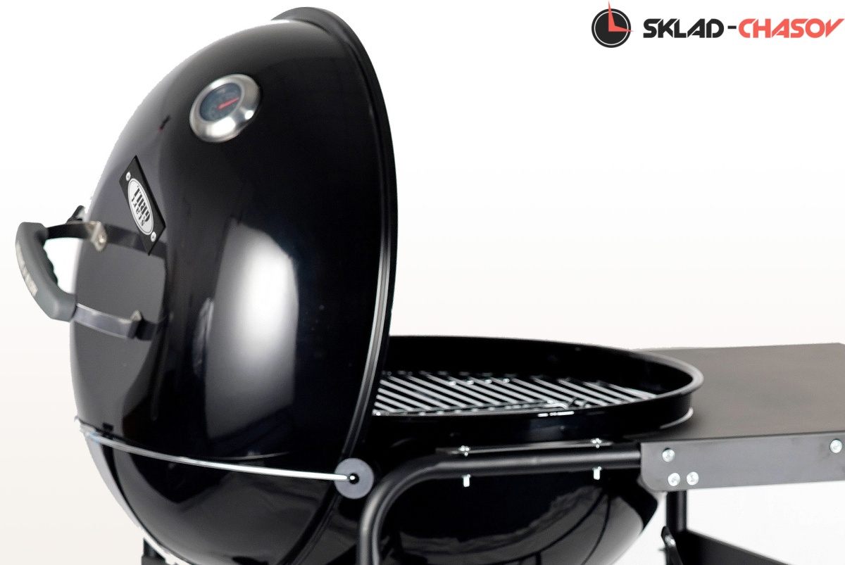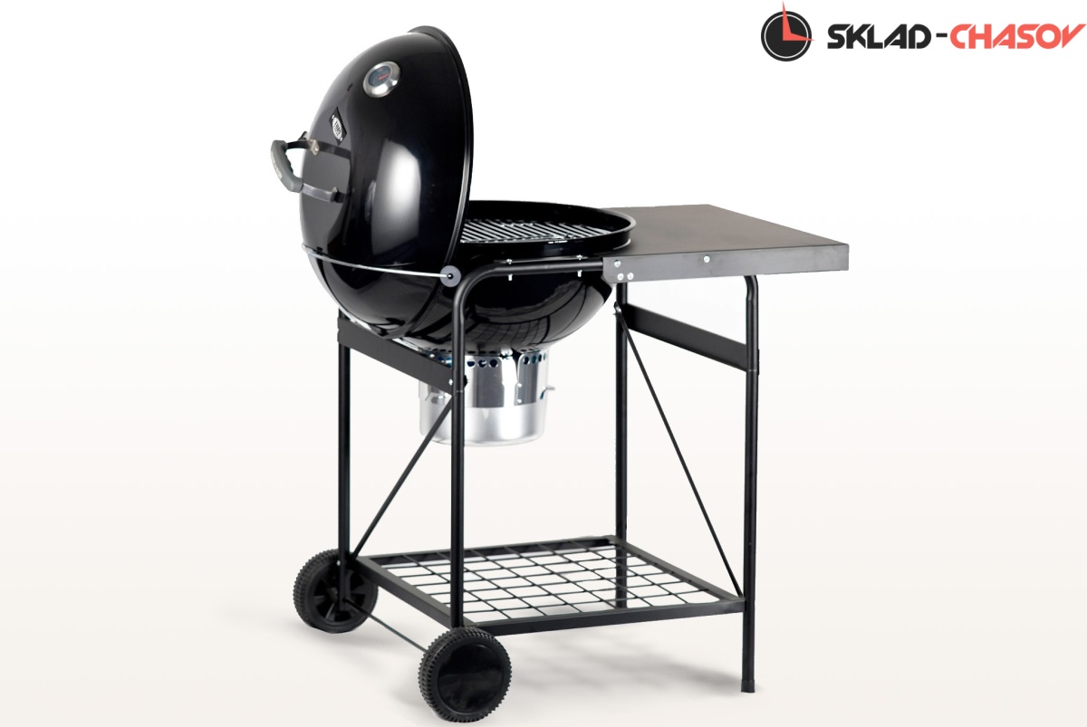 Гриль оснащен монолитными устойчивыми опорами колосника и решетки для приготовления. В комплекте поставки предусмотрены два захвата решетки для быстрого и безопасного снятия. Откидная часть решетки позволяет без лишних усилий добавить уголь. Модель оснащена большими транспортировочными колесами для удобного перемещения, а также функциональной нишей для хранения различных аксессуаров. Большая боковая столешница для посуды и аксессуаров станет незаменимым и удобным дополнением при готовке. Боковой кронштейн для крышки гриля внесет еще больше удобства в процесс приготовления блюд.