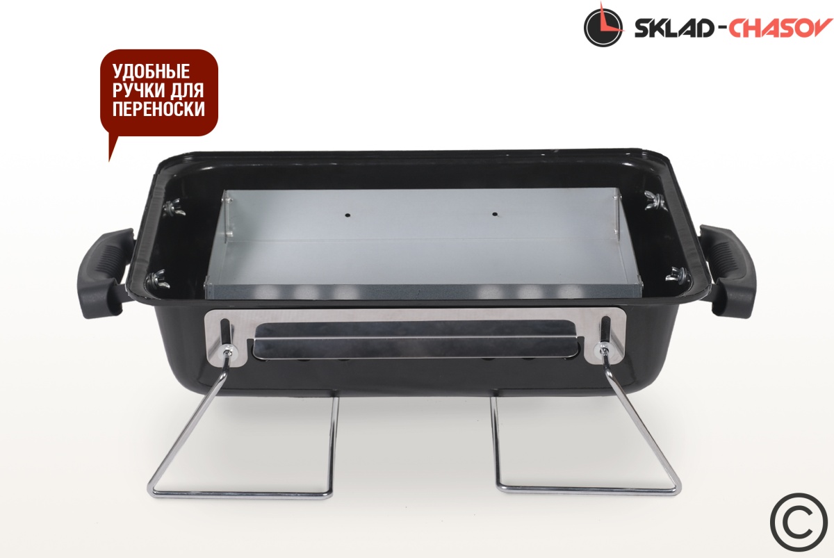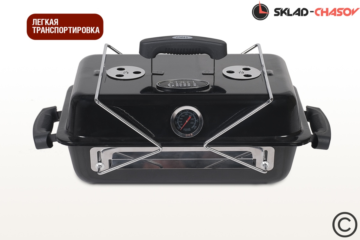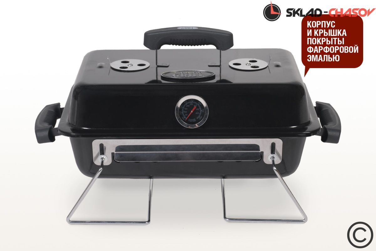 Удобная крышка с ручкой, оснащена термометром. Складные ножки при транспортировке складываются и фиксируют крышку. Входящий в комплект лоток предназначен для копчения и низких температур приготовления. Для жарки основных блюд уголь выкладывается непосредственно в корпус жаровни