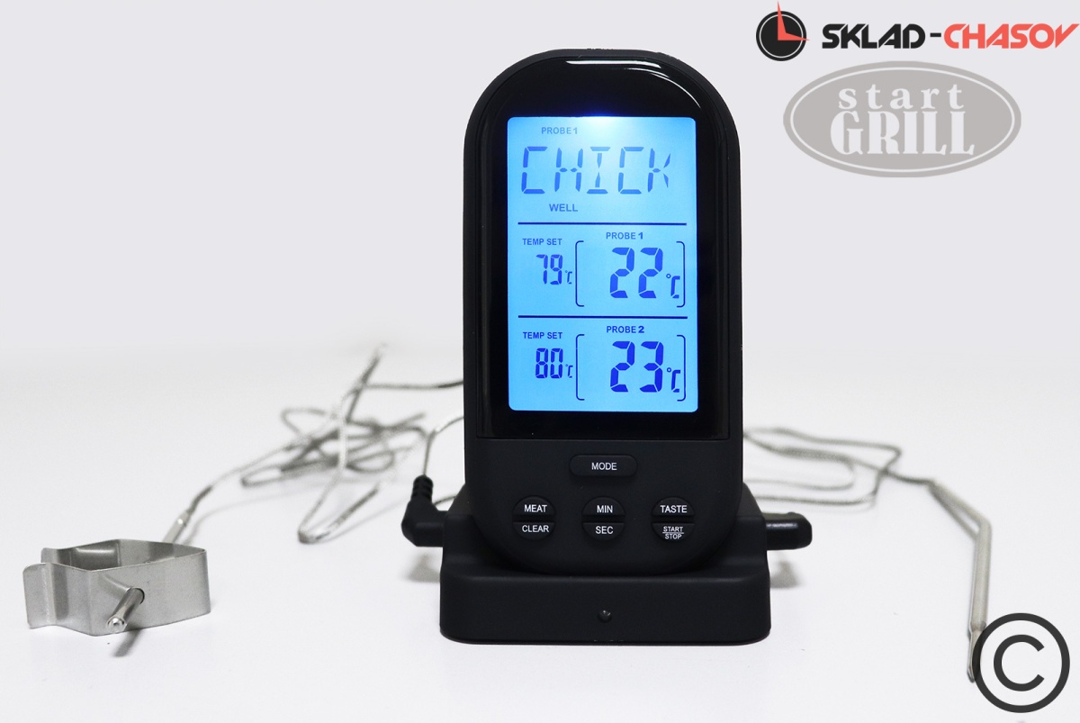 Беспроводной цифровой термометр SG – используется для контроля температуры внутри блюда. Беспроводной цифровой термометр является необходимым и незаменимым инструментом при приготовлении блюд на гриле. Отличительной особенностью данного прибора - наличие двух температурных щупов. Один применяется для контроля температуры внутри блюда, второй для контроля температуры внутри гриля. Цифровой термометр прост и удобен в применении.