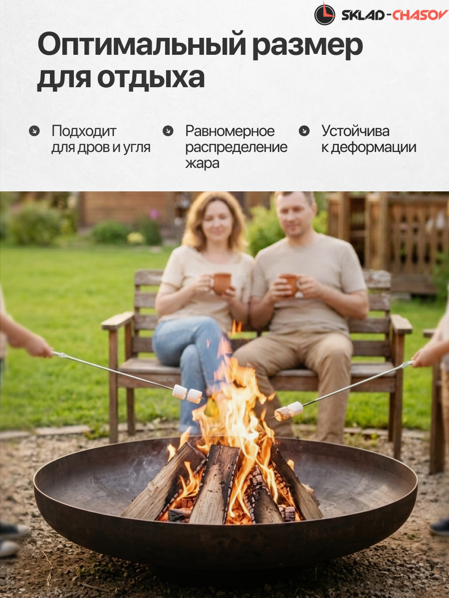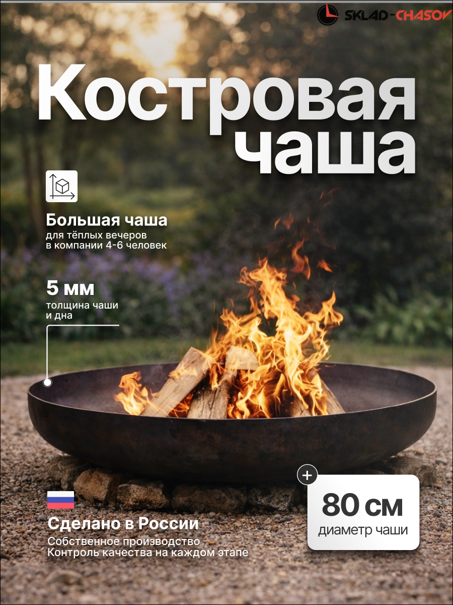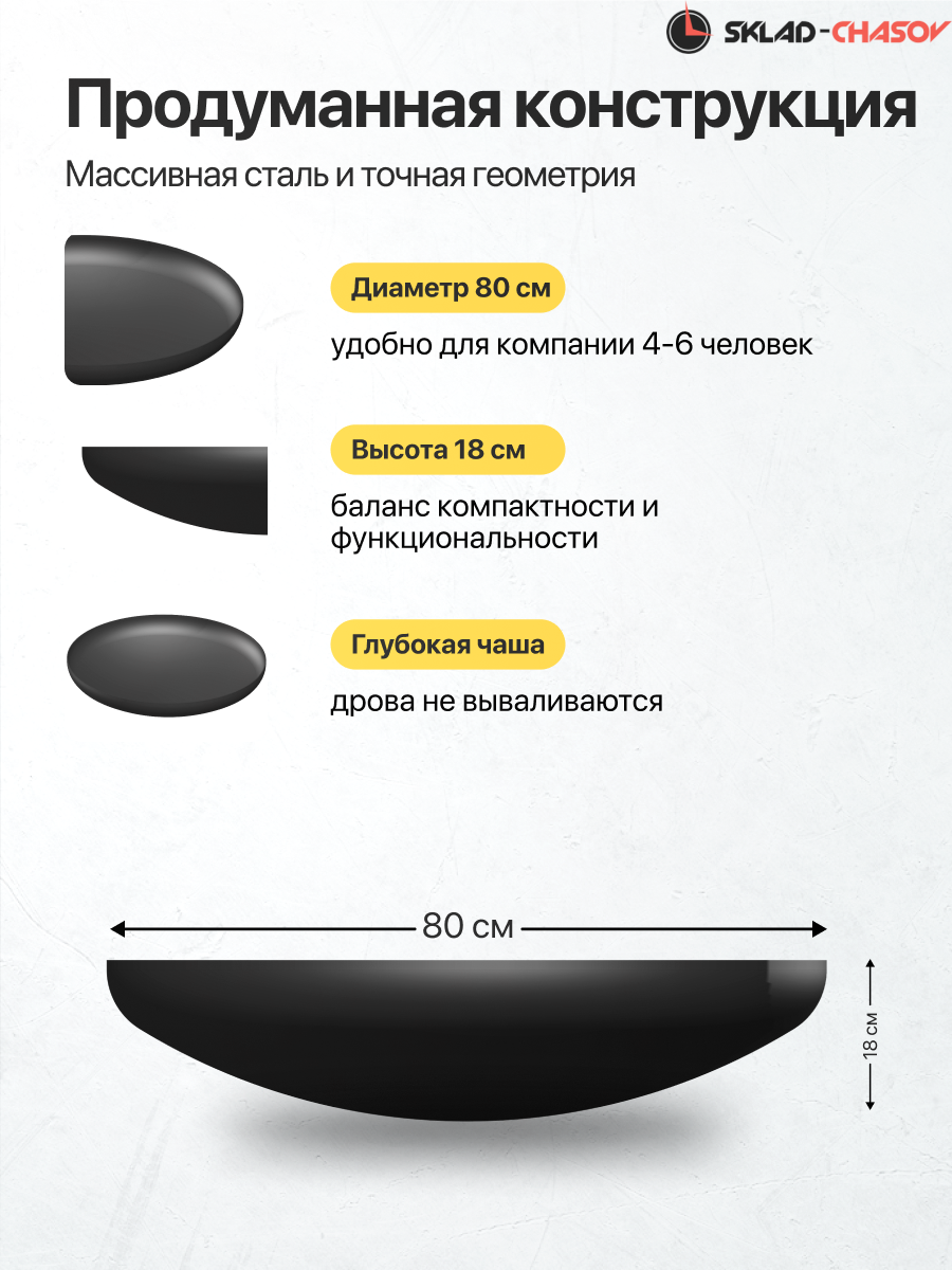 Это оптимальная толщина для долгой службы: металл не прогорает, но чаша остается мобильной. Жаростойкое антикоррозийное покрытие защищает от осадков и перепадов температур — внешний вид сохраняется даже после активного сезона.