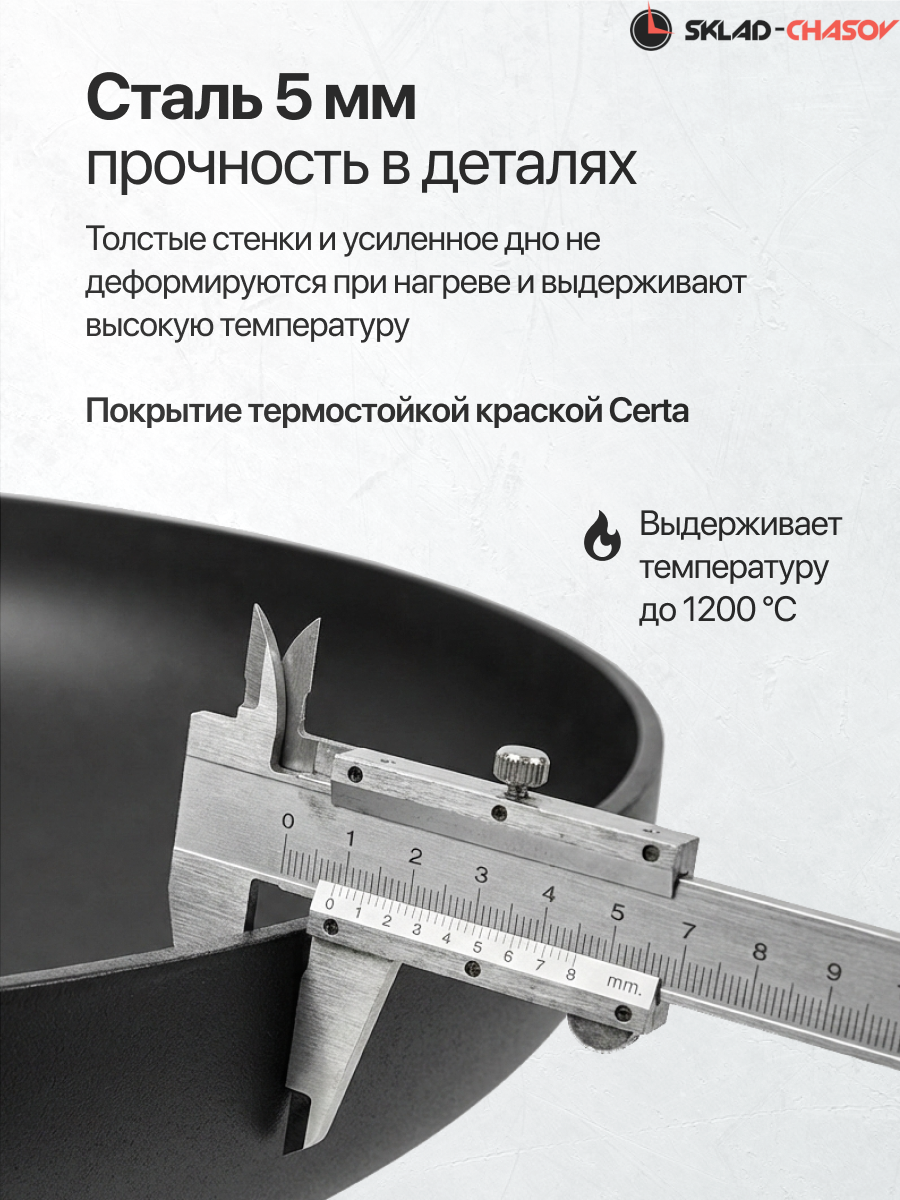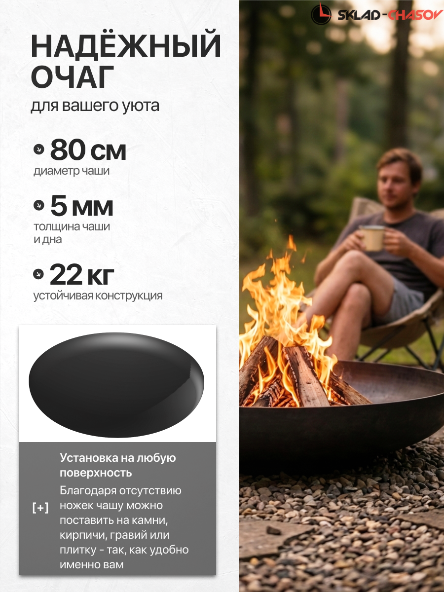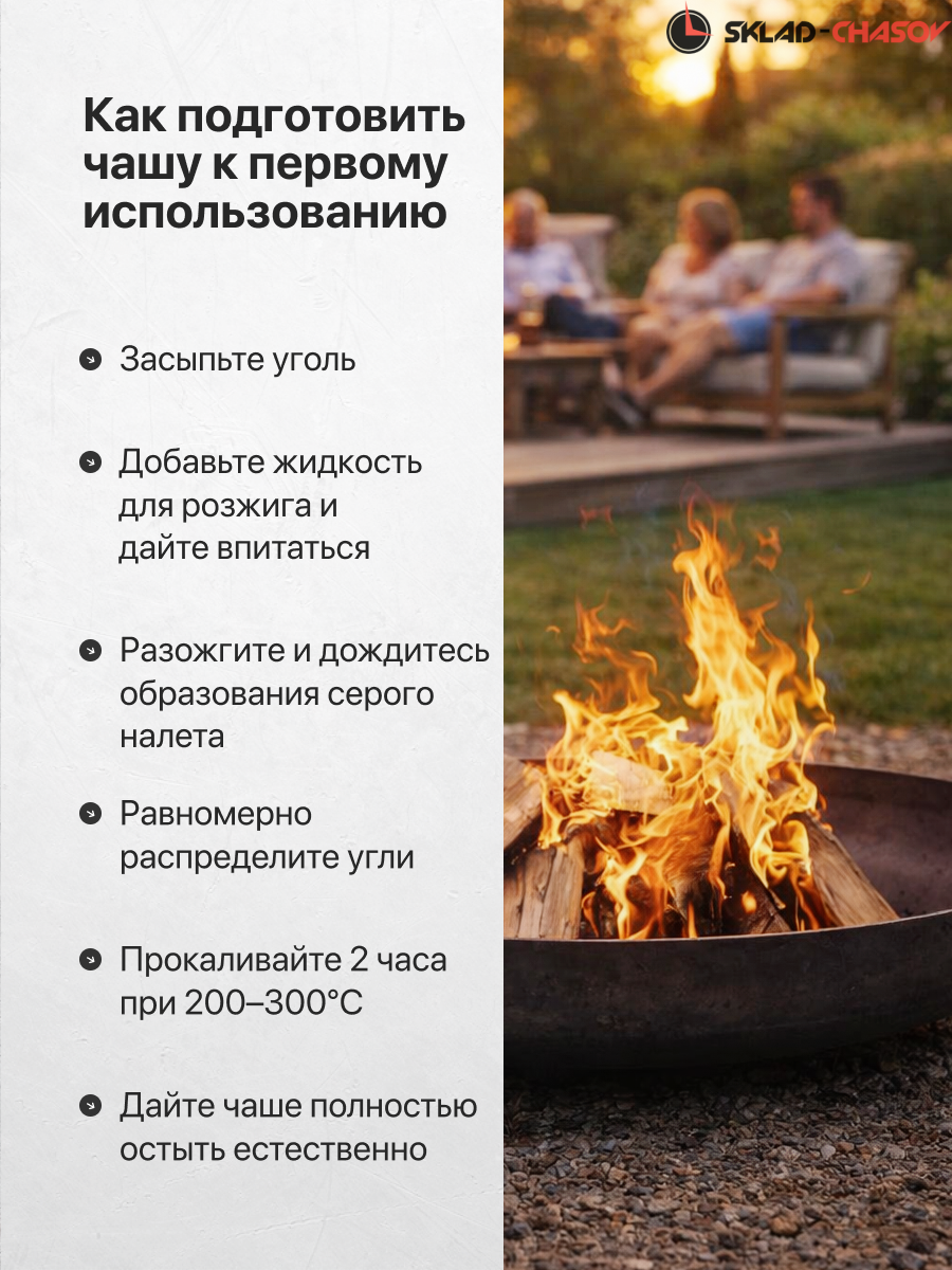 Это оптимальная толщина для долгой службы: металл не прогорает, но чаша остается мобильной. Жаростойкое антикоррозийное покрытие защищает от осадков и перепадов температур — внешний вид сохраняется даже после активного сезона.