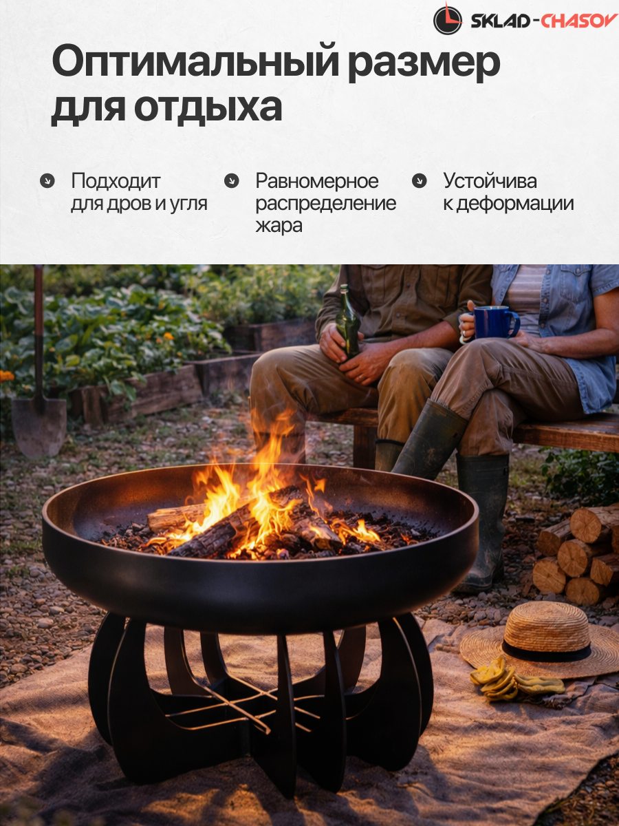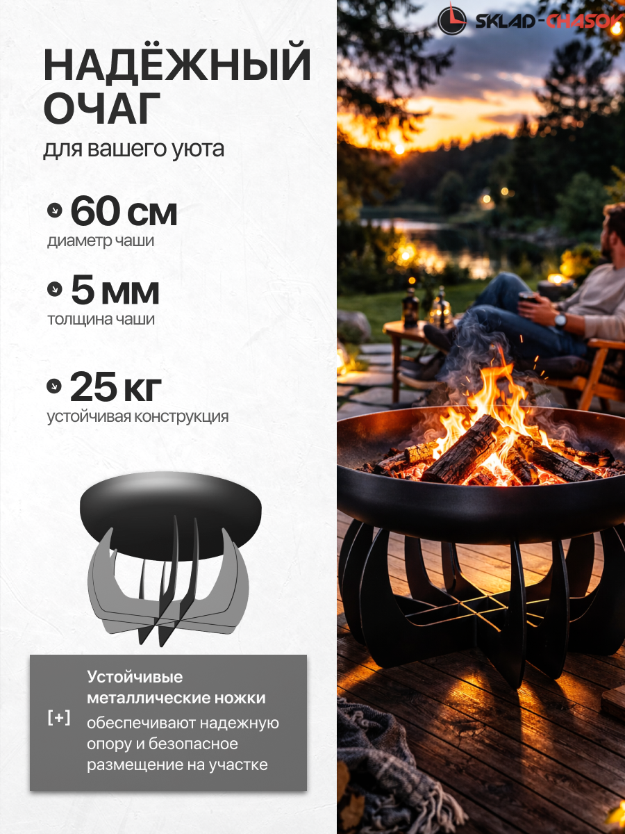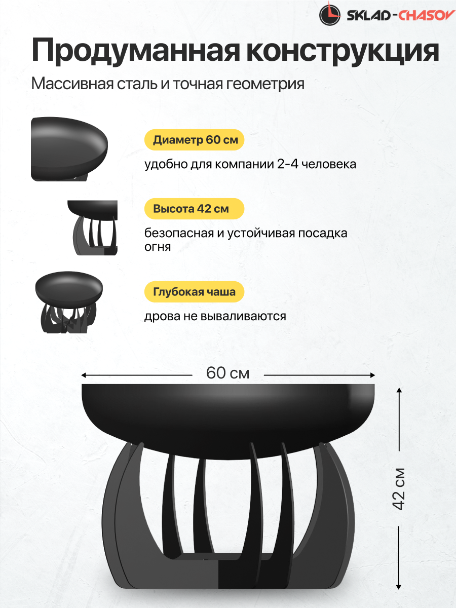 Чаша изготовлена из конструкционной стали толщиной 5 мм. Общий вес конструкции —25 кг. Это не просто легкая штамповка, а массивный, добротный костровой очаг, который простоит десятилетия. Толстый металл не боится экстремальных температур: он не прогорит и не поведет со временем.