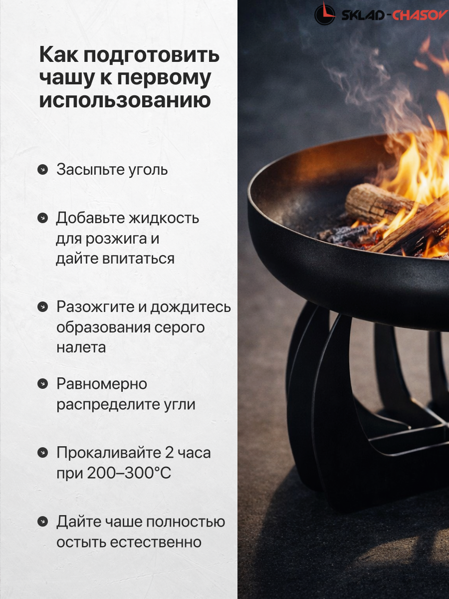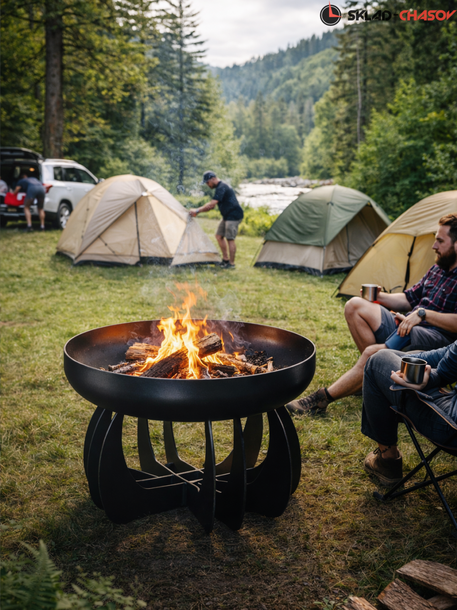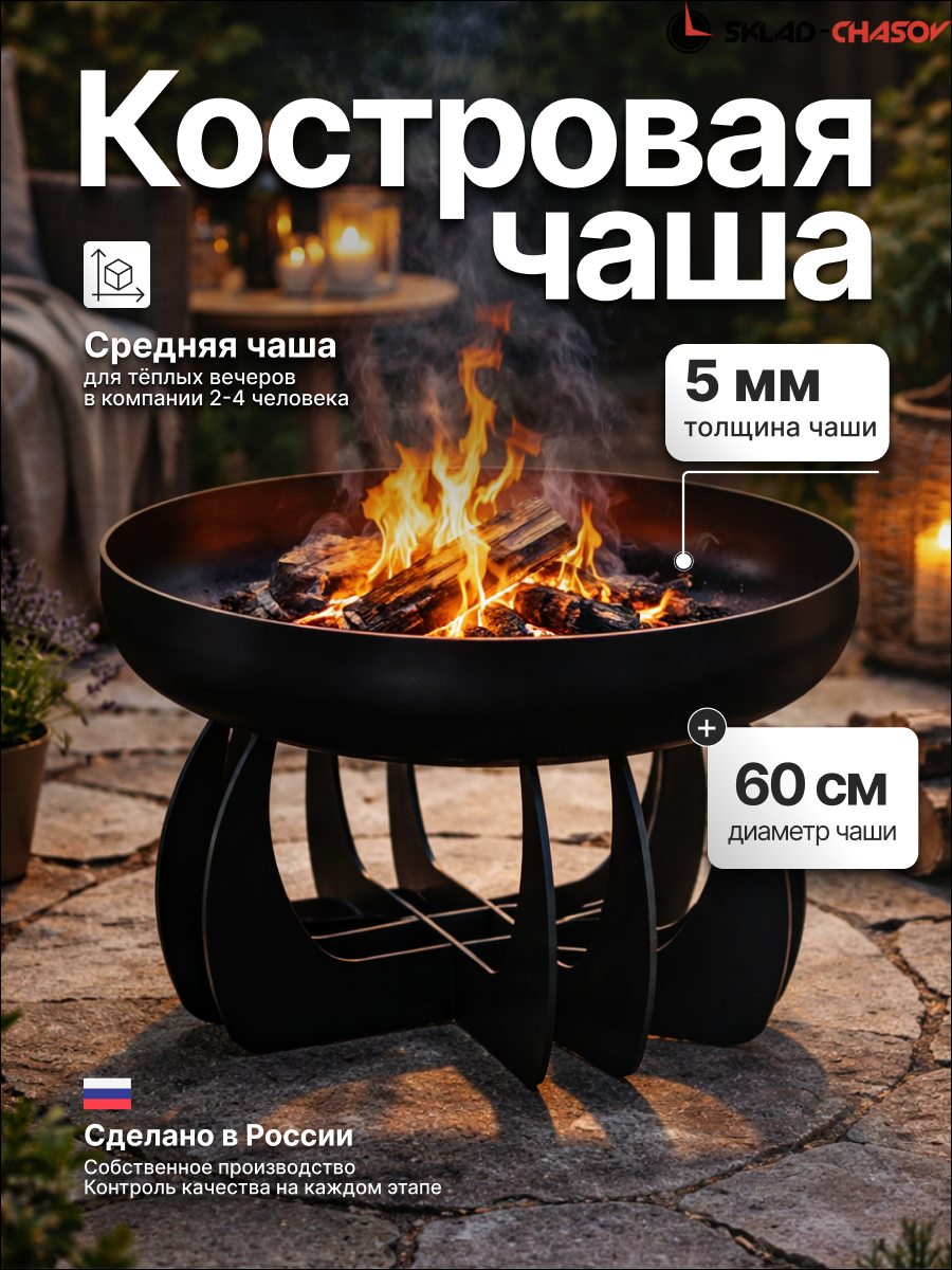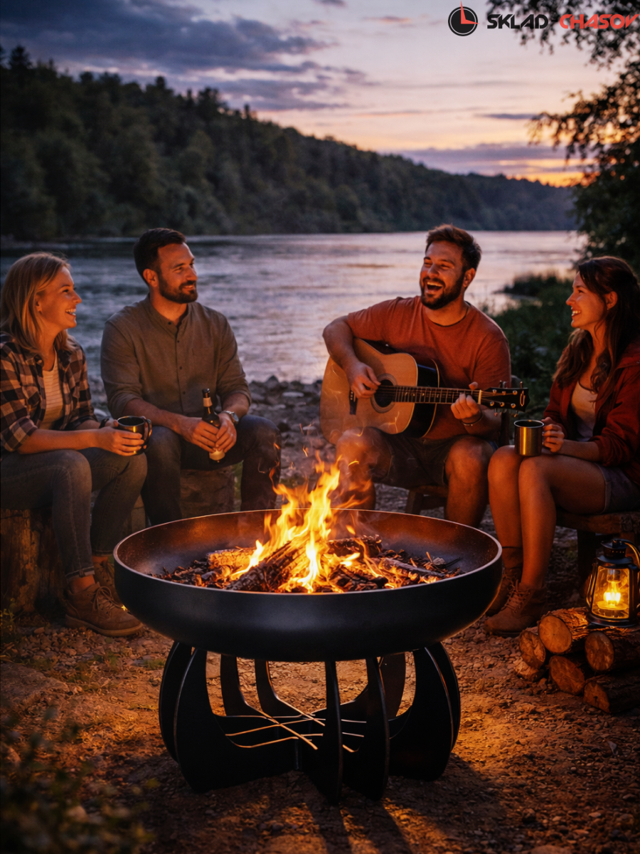 Чаша изготовлена из конструкционной стали толщиной 5 мм. Общий вес конструкции —25 кг. Это не просто легкая штамповка, а массивный, добротный костровой очаг, который простоит десятилетия. Толстый металл не боится экстремальных температур: он не прогорит и не поведет со временем.
