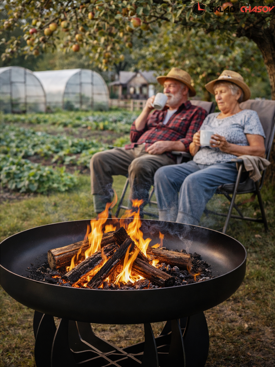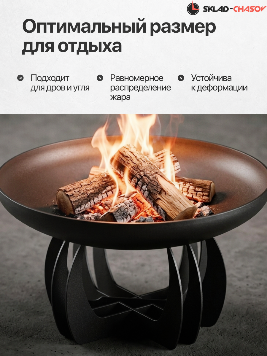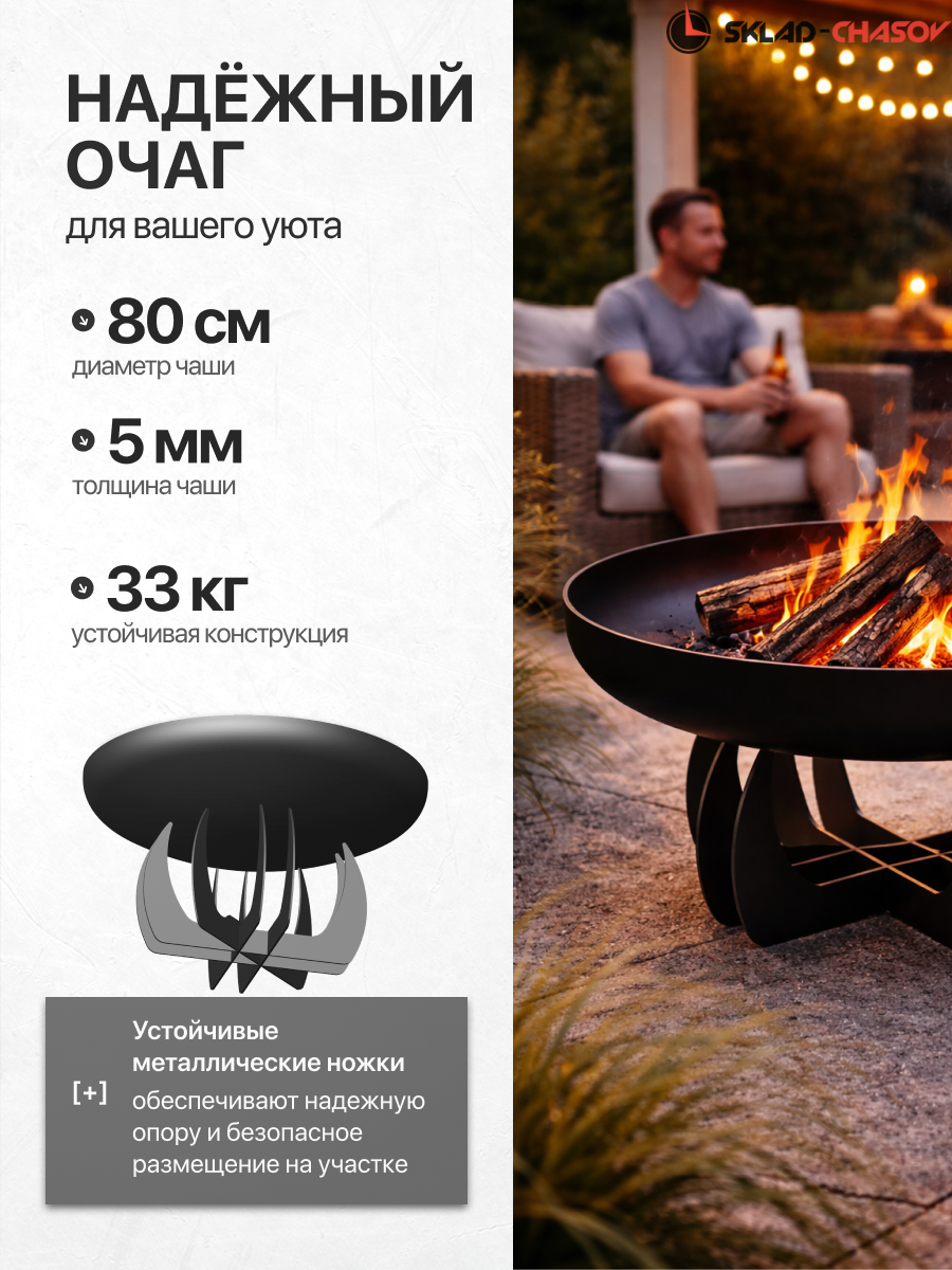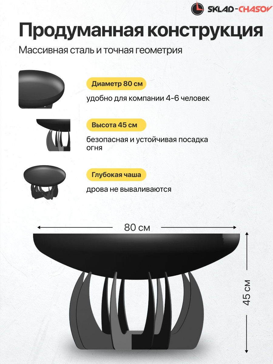 Чаша изготовлена из конструкционной стали толщиной 5 мм. Общий вес конструкции — 33 кг. Это не просто легкая штамповка, а массивный, добротный костровой очаг, который простоит десятилетия. Толстый металл не боится экстремальных температур: он не прогорит и не поведет со временем.