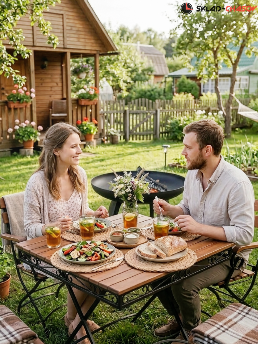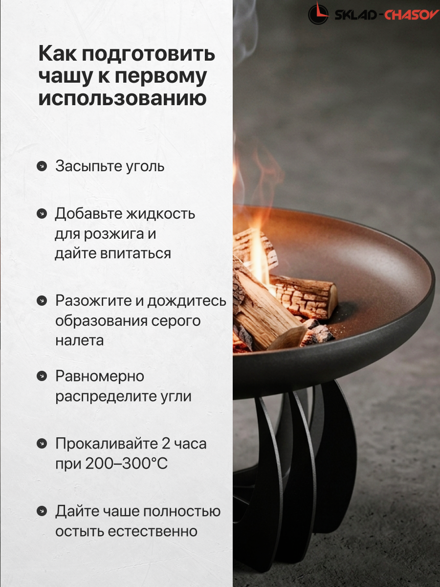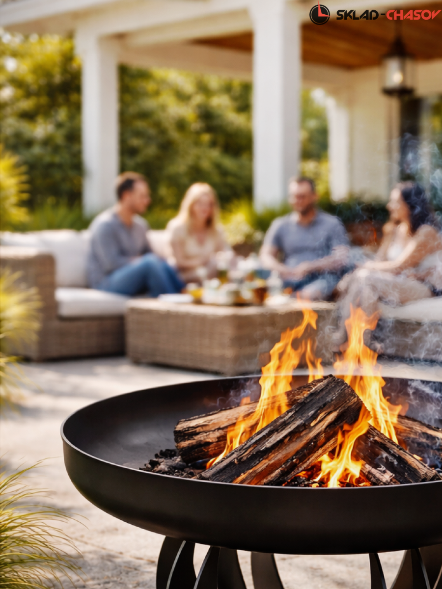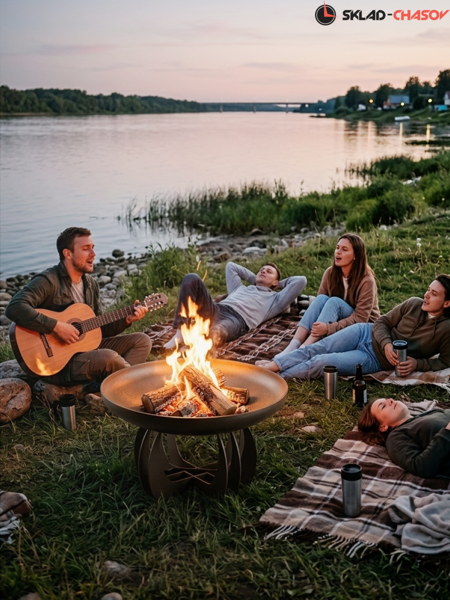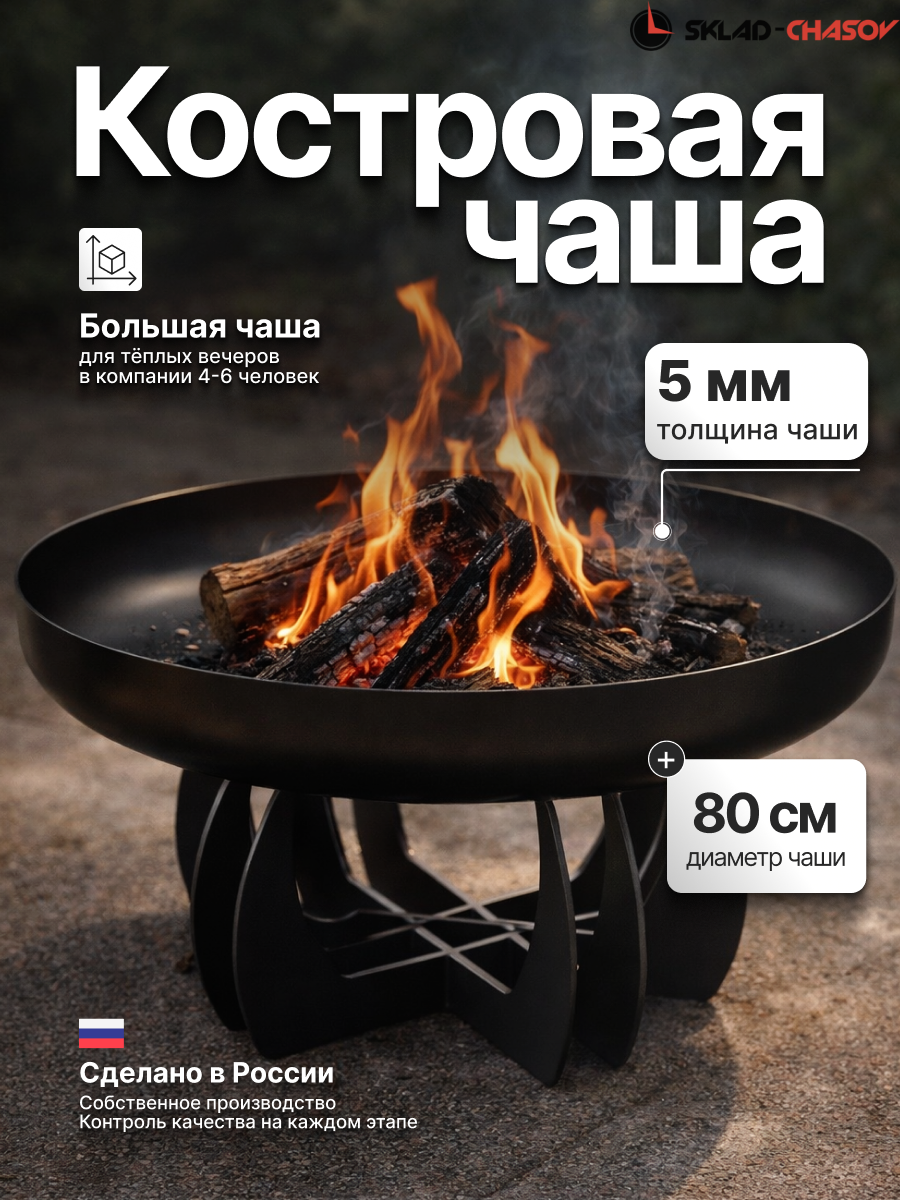 Чаша изготовлена из конструкционной стали толщиной 5 мм. Общий вес конструкции — 33 кг. Это не просто легкая штамповка, а массивный, добротный костровой очаг, который простоит десятилетия. Толстый металл не боится экстремальных температур: он не прогорит и не поведет со временем.