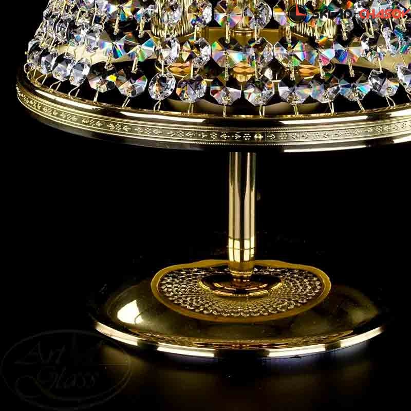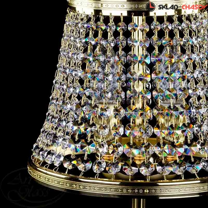 Настольная лампа Art Glass KLOTYLDA dia. 250 TL CE — красивый и функциональный предмет. С ним интерьер становится более праздничным, а сама комната более светлой и уютной. Материал корпуса — латунь — делает источник света долговечным. С течением времени прибор не утрачивает своих характеристик. Плафоны светят вверх, что благоприятно для глаз. Их цвет — прозрачный, а форма — конус. Поверхность плафонов не указано. Основной материал — хрусталь. Вид ламп — накаливания. Цвет корпуса представленной модели золотой. Общая высота составляет 300 мм, а диаметр — 250 мм. Количество ламп — не указано. Цвет свечения — теплый. Цоколь — E14. Вид рассеивателя — декоративный. Среди особенностей представленной модели можно отметить: с подвесками. Страна производства — Чехия. Бренд лампы — ArtGlass.