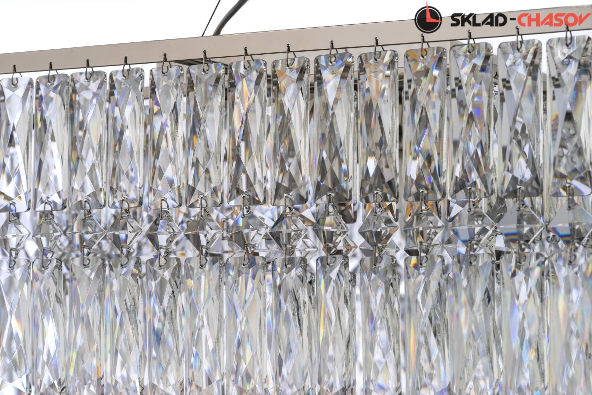 Плафон выполнен из хрусталя, а его поверхность с прозрачной поверхностью, создавая эффект лёгкости и простора. Направление света вниз создаёт функциональное и фокусированное освещение в выбранных областях.
