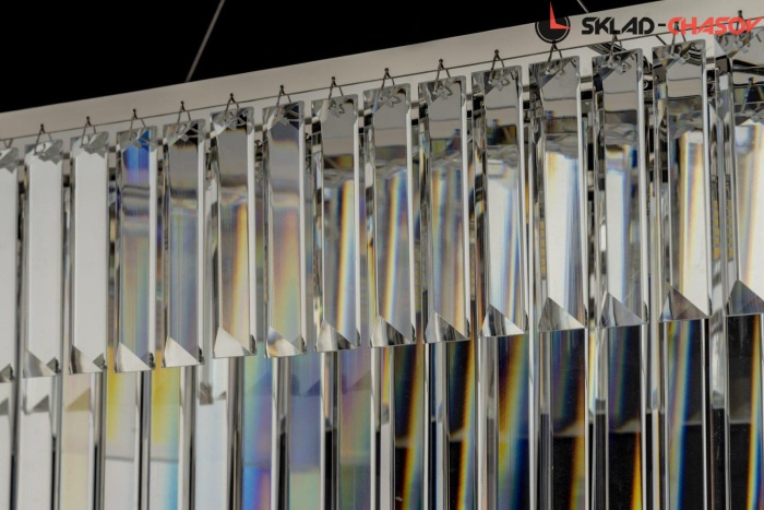 Корпус хрустальной люстры выполнен из премиального металла, никель/хромовый цвет привносит в ваш интерьер глубину. Плафон в прозрачном цвете дополняет общую композицию, добавляя модели легкость и элегантность.