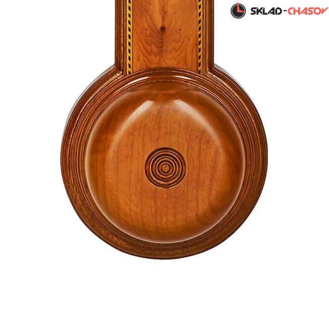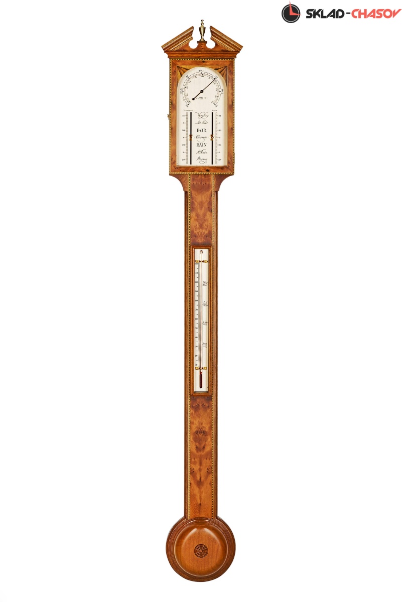 Барометр на дверной ручке Sheraton, около 1810 года. Копия оригинала, изготовленная Комитти в 1860 году. Шкаф из вишневого дерева, облицованный тисовым шпоном, инкрустированный "веревочной" линией по краям и угловыми вентиляторами.