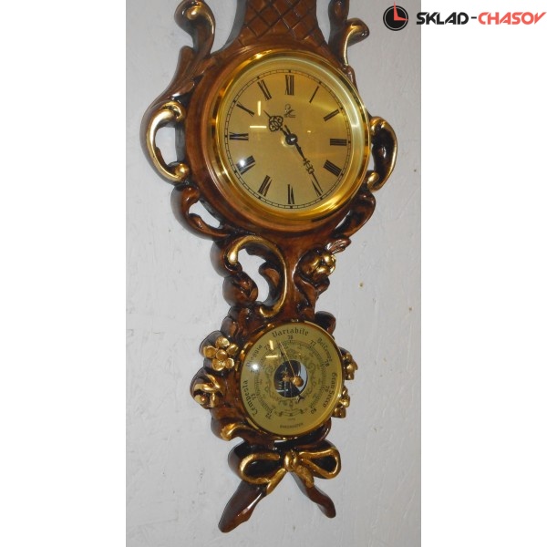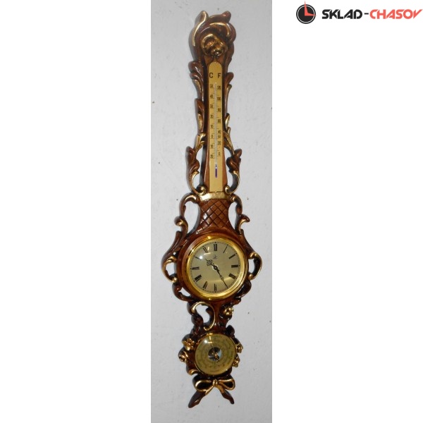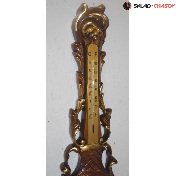 Настенный барометр "Людовик XVI" из массива дерева ручной работы полированный орех с деталями из сусального золота, с термометром и часами и барометром.