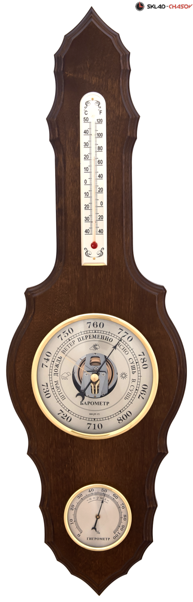 Механическая метеостанция, состоящая из барометра, термометра и гигрометра. Корпус из массива березы и дуба.