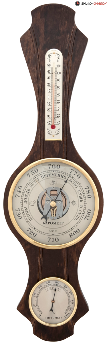 Механическая метеостанция, состоящая из барометра, термометра и гигрометра. Корпус из массива дуба и березы.