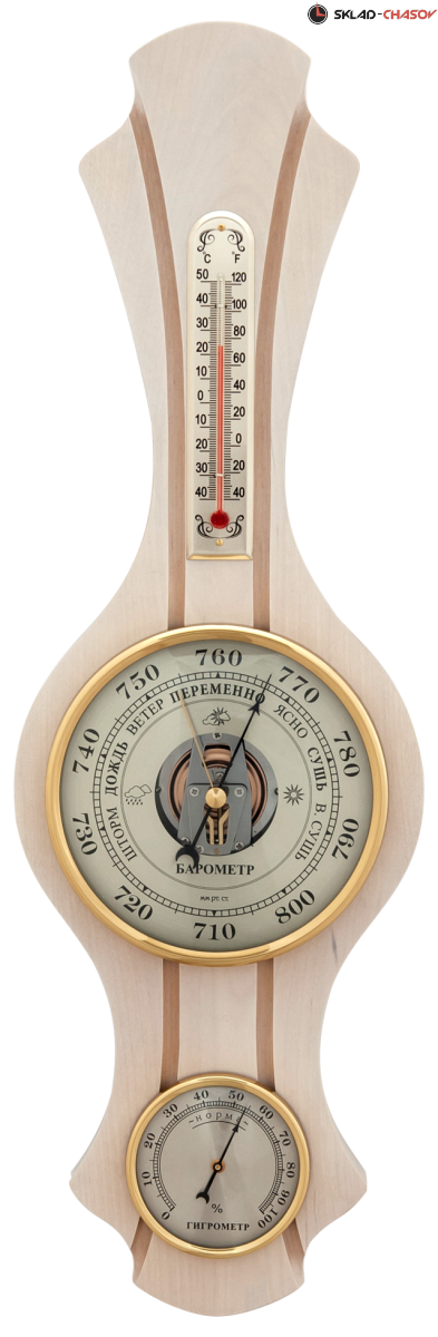 Механическая метеостанция, состоящая из барометра, термометра и гигрометра. Корпус из массива дуба и березы.