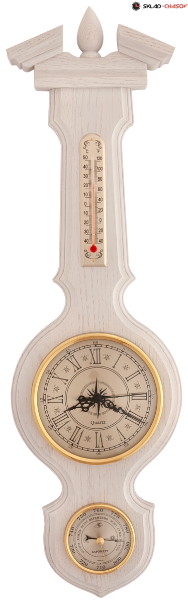 Механическая метеостанция, состоящая из часов, барометра, гигрометра и термометра. Корпус из массива дуба и березы.