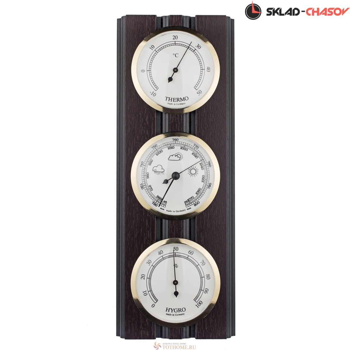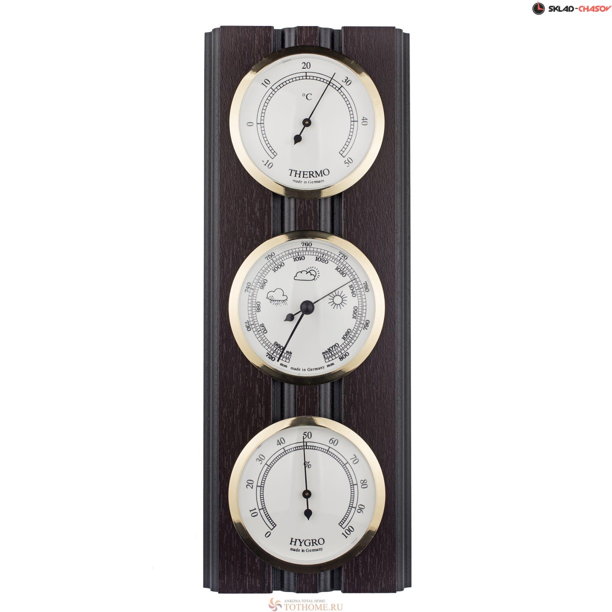 Механическая метеостанция, состоящая из барометра, термометра и гигрометра. Корпус из массива дерева.