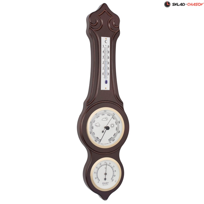 Механическая метеостанция, состоящая из барометра, термометра и гигрометра. Корпус из массива дерева.