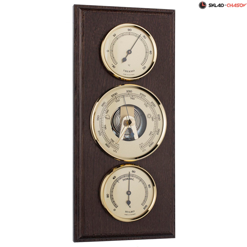 Механическая метеостанция, состоящая из барометра, термометра и гигрометра. Корпус из массива дерева.