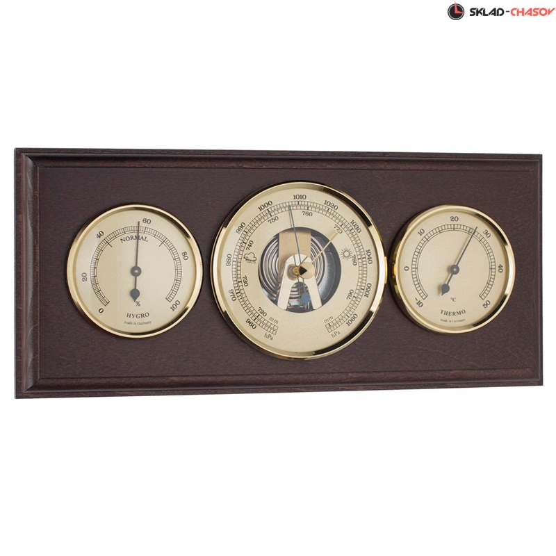 Механическая метеостанция, состоящая из барометра, термометра и гигрометра. Корпус из массива дерева.
