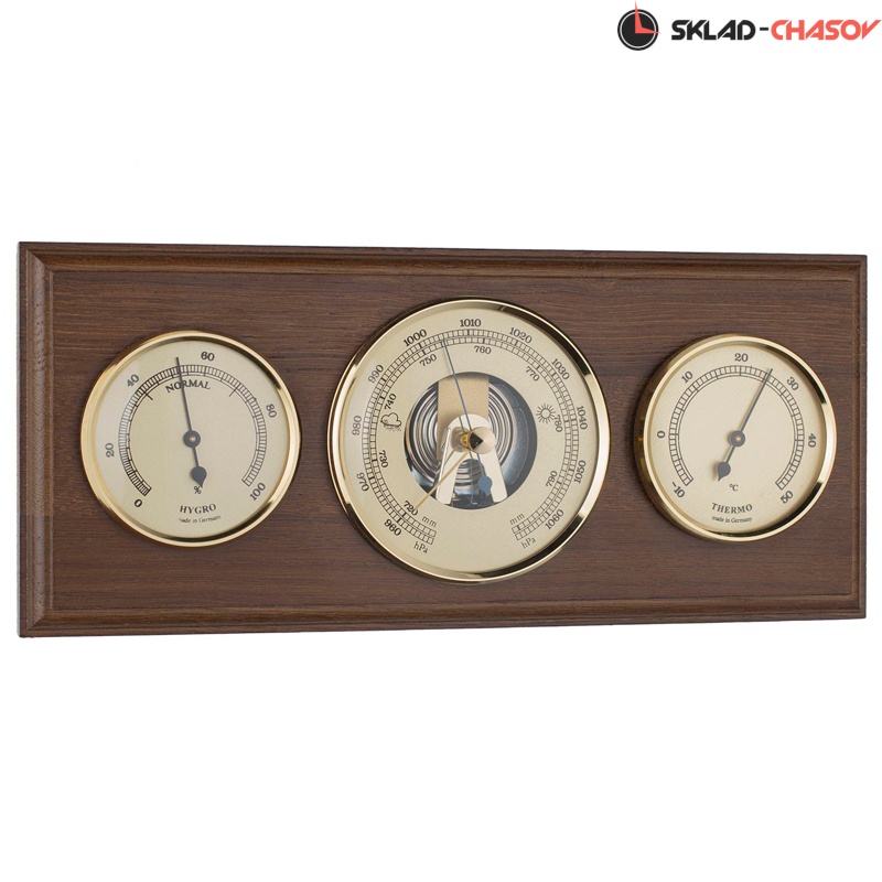 Механическая метеостанция, состоящая из барометра, термометра и гигрометра. Корпус из массива дерева.
