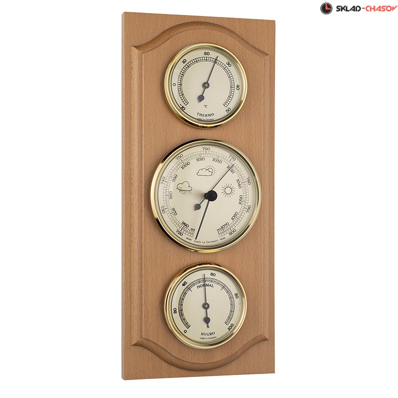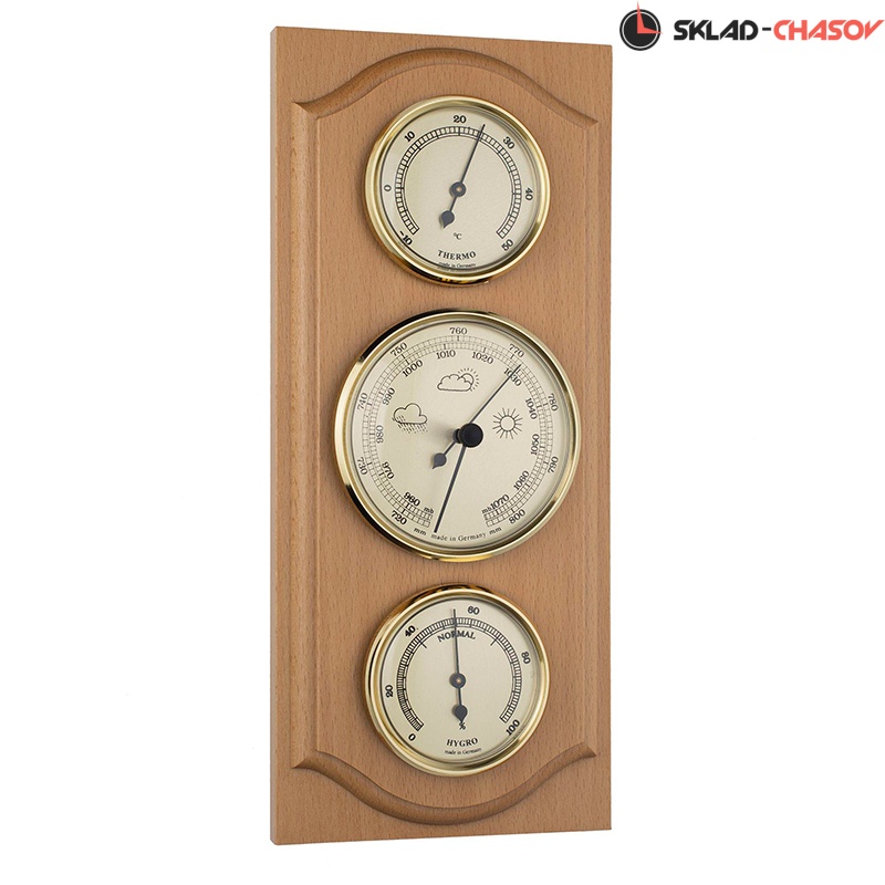 Механическая метеостанция, состоящая из барометра, термометра и гигрометра. Корпус из массива дерева.