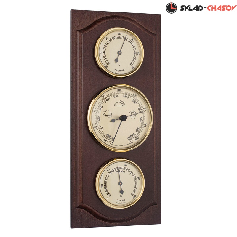 Механическая метеостанция, состоящая из барометра, термометра и гигрометра. Корпус из массива дерева.