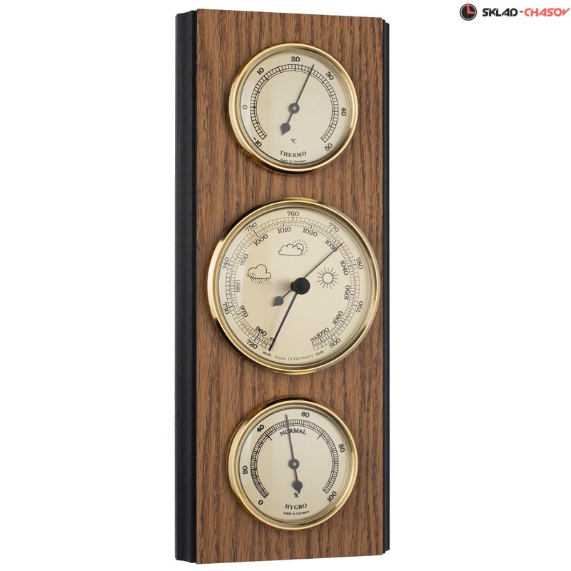 Механическая метеостанция, состоящая из барометра, термометра и гигрометра. Корпус из массива дерева.