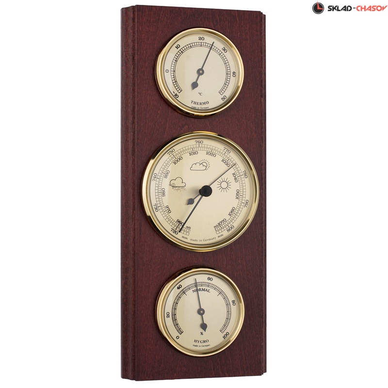 Механическая метеостанция, состоящая из барометра, термометра и гигрометра. Корпус из массива дерева.