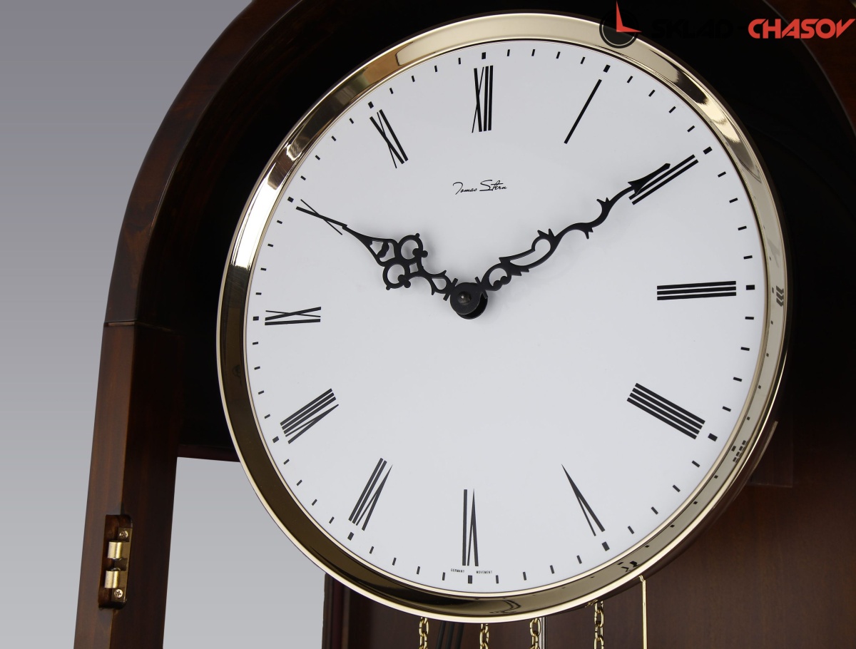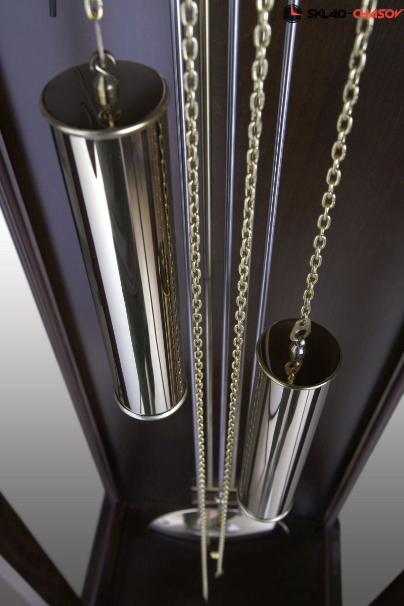 Немецкий механизм Hermle - цепной подвес гирь, 8-дневный запас хода, бой каждые 1/2 часа и в ровный час, с возможностью ручного отключения.