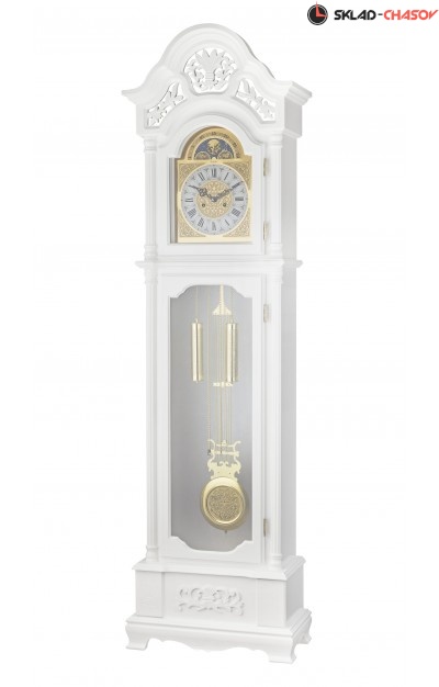Механические напольные часы. Корпус изготовлен из массива дерева и тонирован в белом цвете с золотыми акцентами. Резные элементы, стекло в передней дверце. Запас хода на 31 день. Пружинный завод, получасовой бой. Ручное отключение боя.