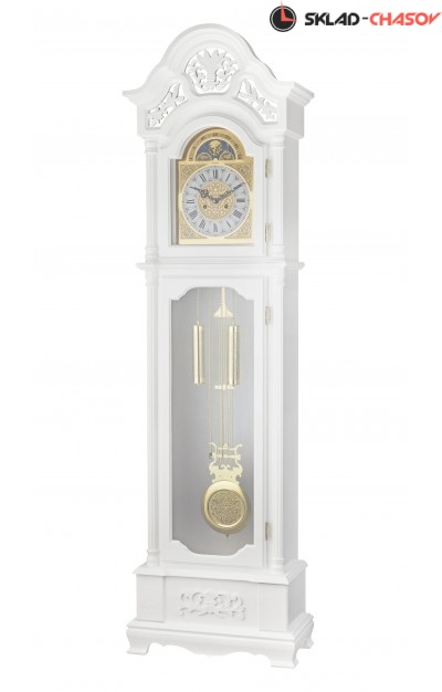 Механические напольные часы. Корпус изготовлен из массива дерева и тонирован в белом цвете. Резные элементы, стекло в передней дверце. Запас хода на 31 день. Пружинный завод, получасовой бой. Ручное отключение боя.