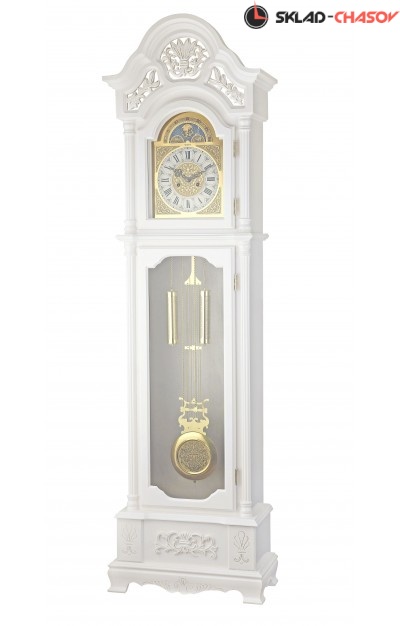 Бесплатная доставка до вашего населенного пунктаМеханические напольные часы. Корпус изготовлен из массива дерева и тонирован в белом цвете с золотыми акцентами. Резные элементы, стекло в передней дверце. Запас хода на 31 день. Пружинный завод, получасовой бой. Ручное отключение боя.