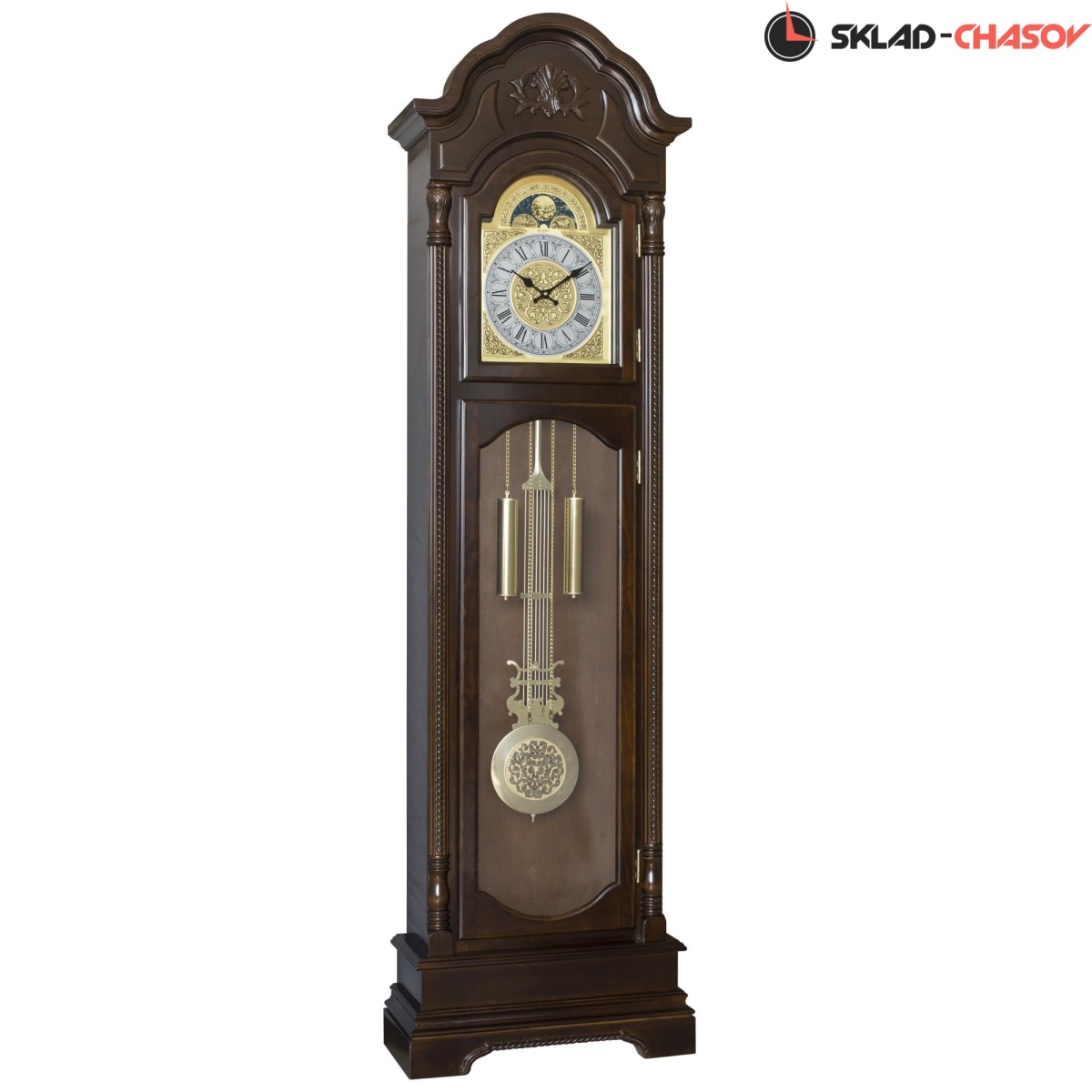 Механические напольные часы. Корпус изготовлен из массива дерева и тонирован в цвете орех. Резные элементы, стекло в передней дверце. Запас хода на 31 день. Пружинный завод, получасовой бой. Ручное отключение боя.