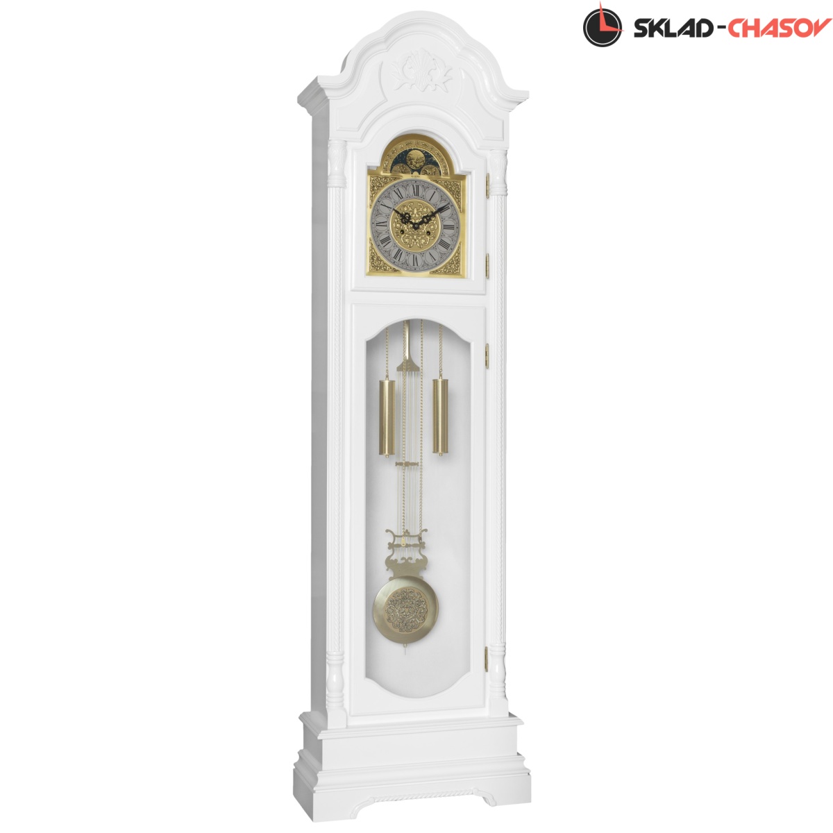 Механические напольные часы. Корпус изготовлен из массива дерева и тонирован в белом цвете. Резные элементы, стекло в передней дверце. Запас хода на 31 день. Пружинный завод, получасовой бой. Ручное отключение боя.