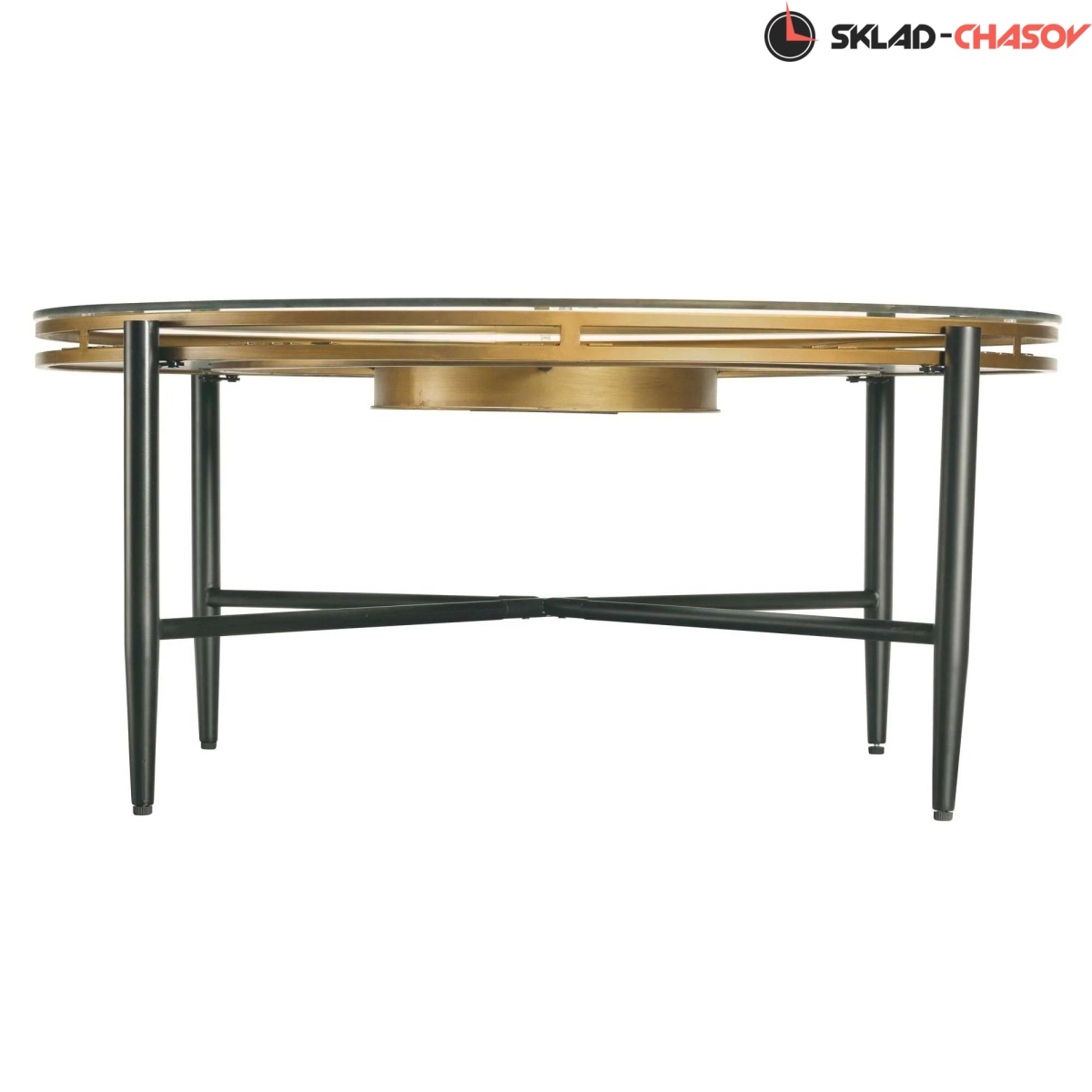 Большой (101см) металлический циферблат закрыт закаленным стеклом толщиной 8мм, что одновременно добавляет и изысканности и надежности. Циферблат установлен на укороченных цилинрических ножках черного цвета.