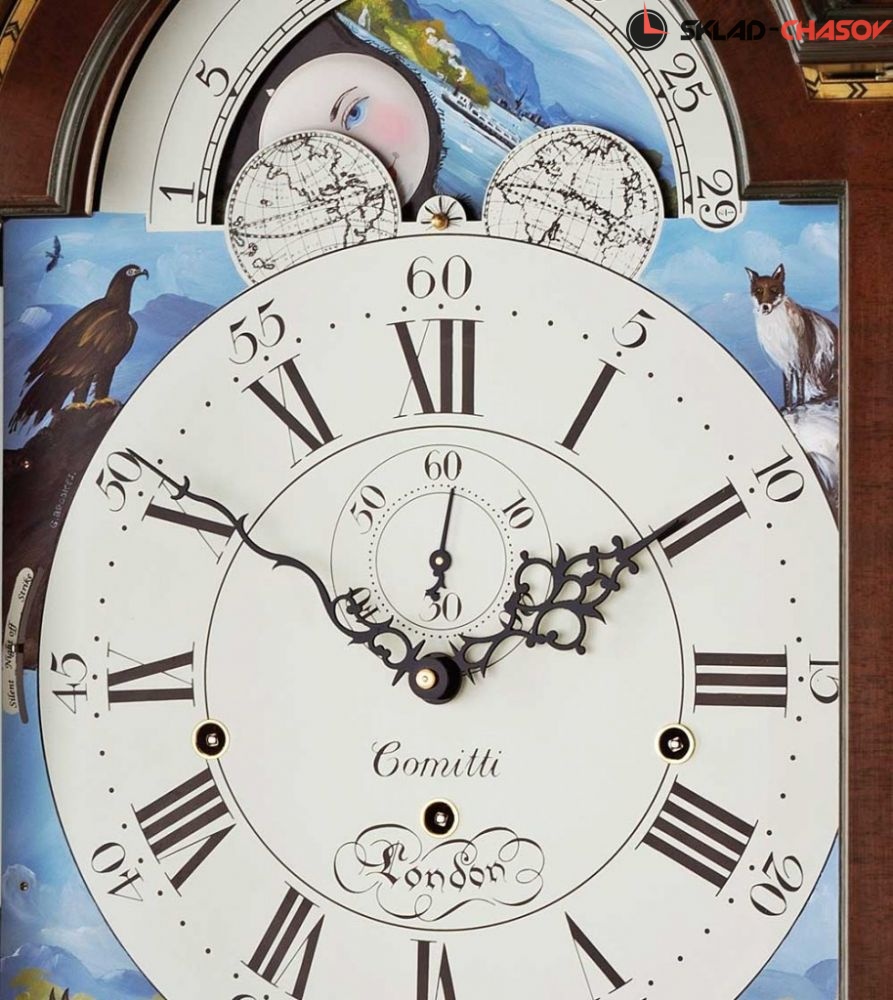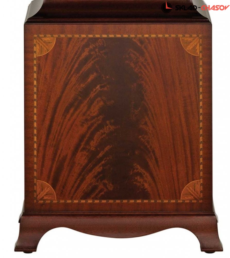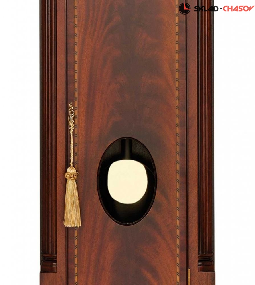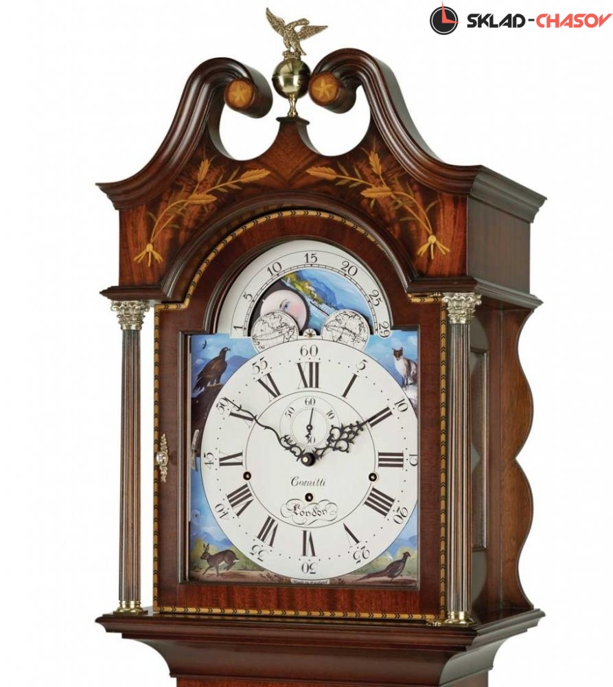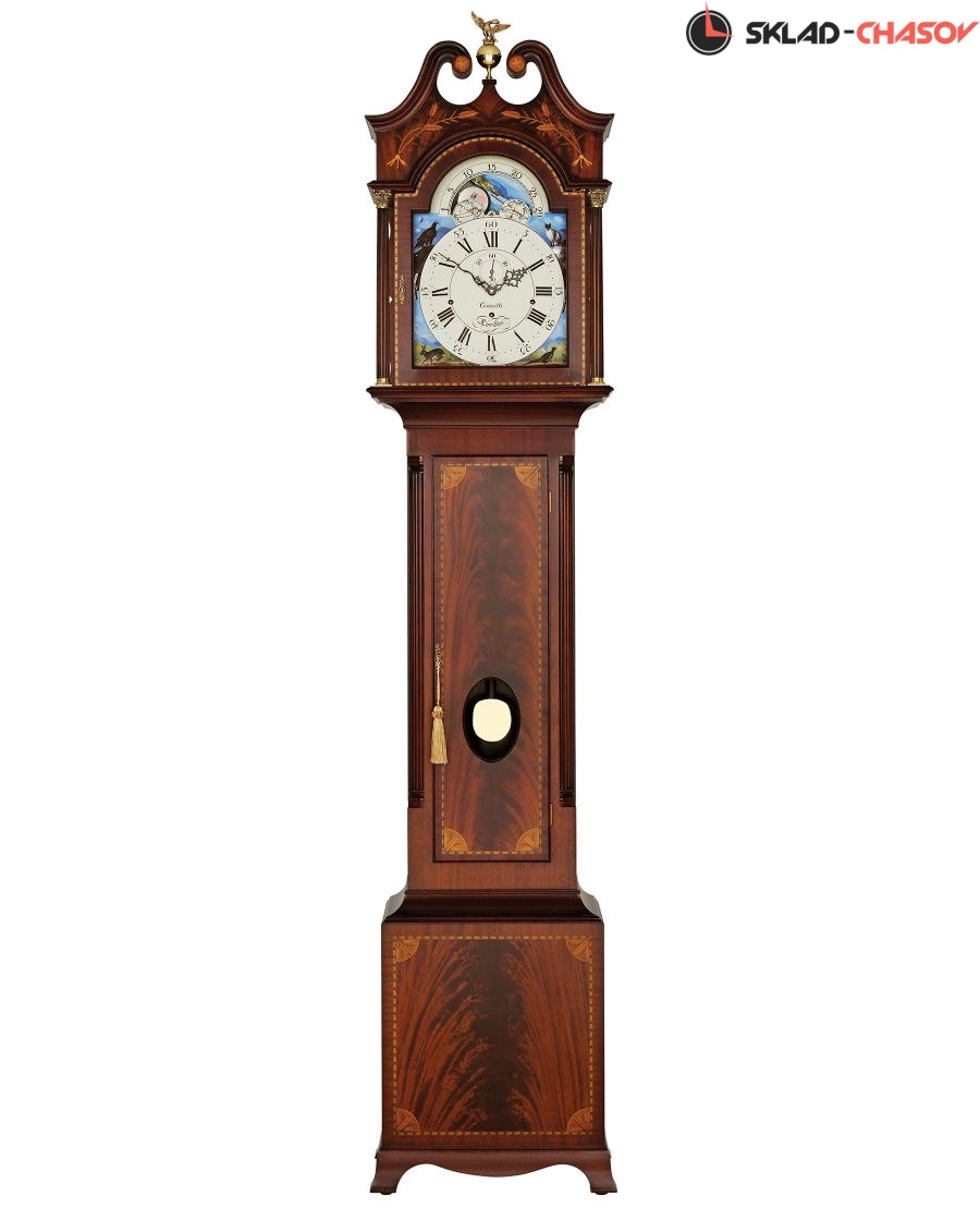 Напольные часы в стиле Шератон, вдохновленные шотландским мастером Уильямом Роббом из Монтроуза, около 1790 года. Широкое использование шахматной окантовки и инкрустаций маркетри подчеркивает превосходный цвет облицовки из красного дерева Gleneagle. Витой фронтон украшен маркетри с пшеничным мотивом и увенчан орлом из литой латуни. Шкаф стоит на раздвинутых ножках и украшен рифлеными четвертными колоннами на торце и "коринфскими" колоннами на капоте. Циферблат часов украшен ручной росписью в виде луны "Дикая природа Озерного края", подписанной художником. Корпус протерт вручную и покрыт воском для придания ему "античного" оттенка.