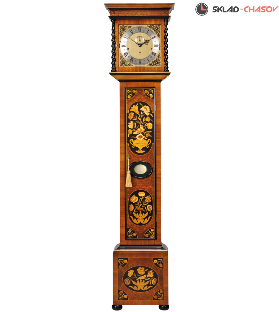 Превосходный длинный футляр, созданный по проекту выдающегося лондонского мастера Джозефа Книбба (1640-1711). Футляр из орехового дерева украшен шпоном грецкого ореха и изящными вставками маркетри. На маркетри изображены птицы и цветочные мотивы, популярные в корпусной мебели эпохи Вильгельма и Марии. Капот украшен витыми столбиками из ячменя и резьбой ручной работы. Циферблат из цельной латуни украшен гирляндами в виде херувимов, посеребренным кольцом в виде главы и синими лакированными стрелками того времени. Для изготовления декоративных панелей используются самшит, груша, грецкий орех, сатиновое дерево и платан, окрашенный в черный цвет. Шкаф покрыт воском ручной работы.