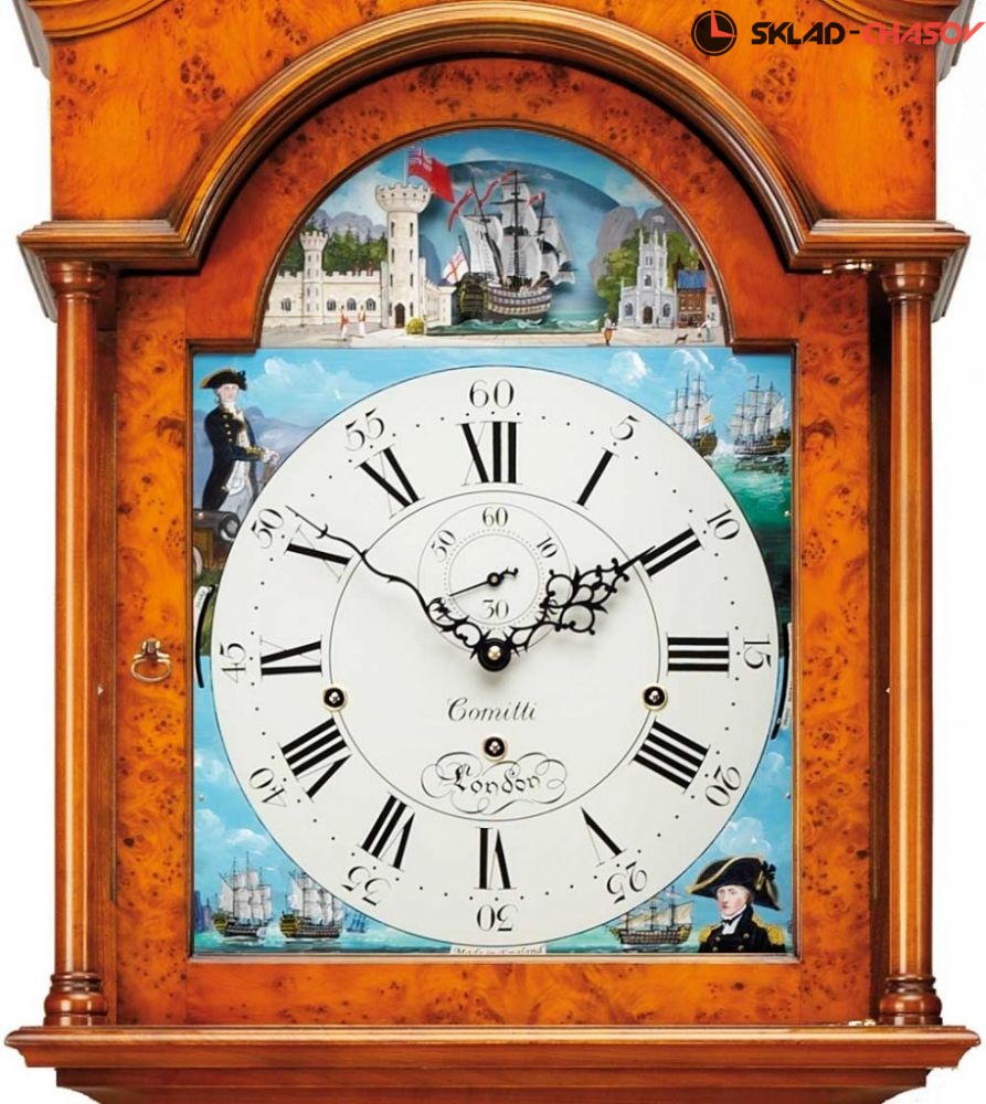 Элегантность эпохи регентства Трафальгарской вдохновила модельера на создание шкафа со спиральным верхом. Шкаф из массива вишни отделан шпоном тиса в тон книге, инкрустированным кантом по краю. Циферблат часов украшен ручной росписью, посвященной Трафальгарской битве 1805 года. На иллюстрации изображены адмирал Нельсон, капитан Томас Харди, а также французские и испанские корабли, участвовавшие в битве. Королевский крейсер его величества Виктори скачет в такт движениям машины. Циферблат подписан художником. Корпус вручную обработан воском для придания ему "античного" блеска. По запросу возможна индивидуальная отделка и другие варианты циферблата.