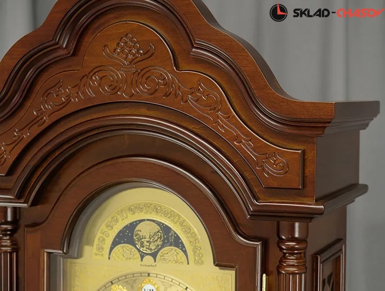Сам корпус украшен арочным фронтоном, с накладными резными элементами, мотивами резьбы, перекликаясь с узорами нижней тумбы.