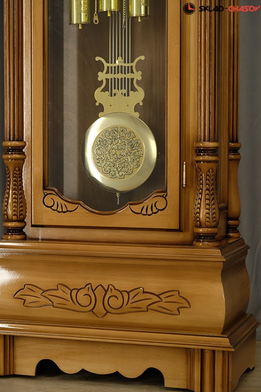 Позолоченные гири и маятник, изысканно подчеркивают общую тонировку часов.