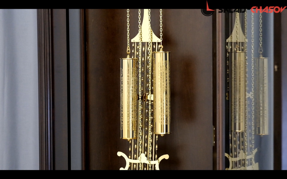 Остекление по всей высоте дверцы, открывает вид на маятник в виде лиры и гири из полированной латуни;