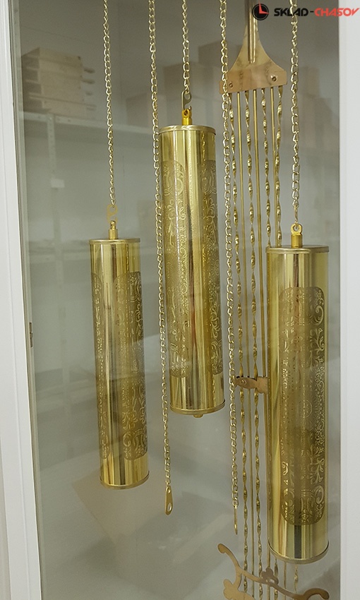 Лирообразный маятник и гири, цвета матового никеля, повторяют узорами центральный диск циферблата.