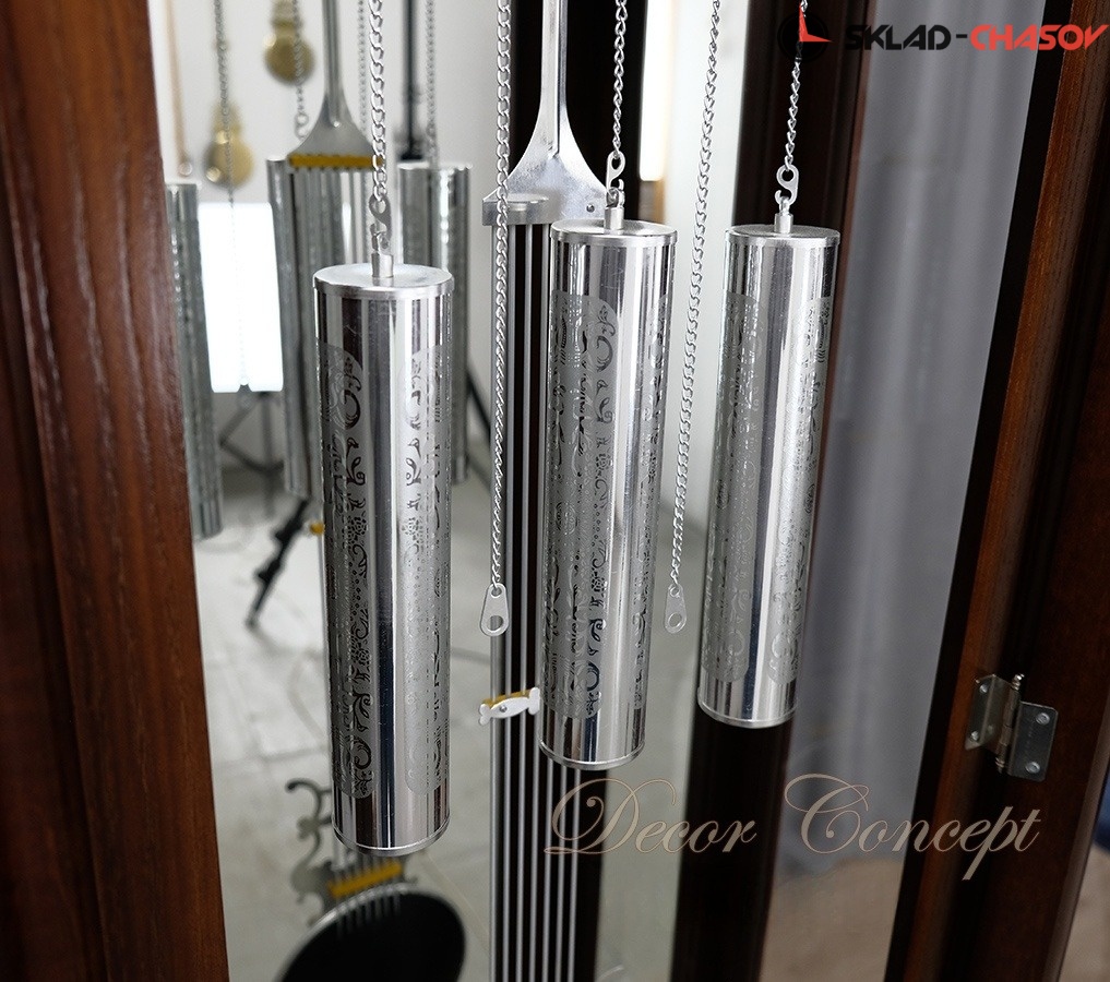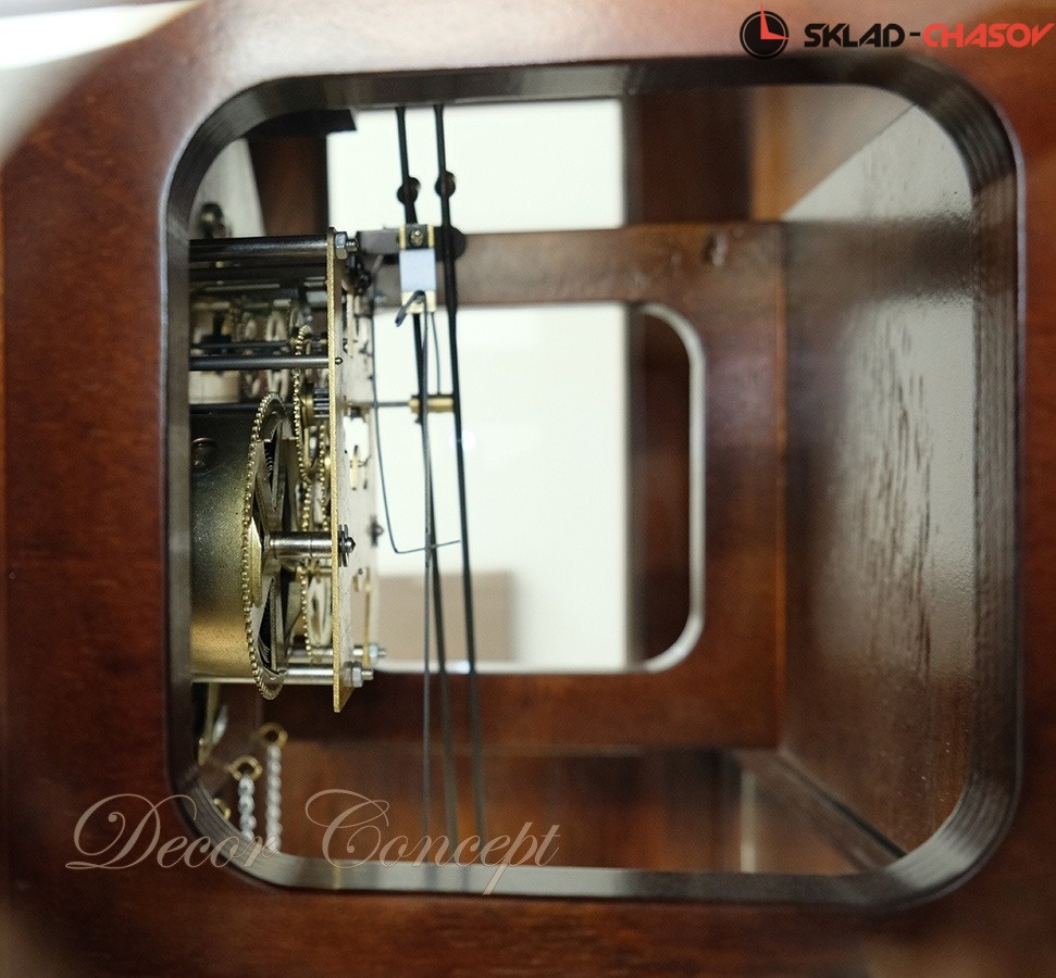 Механизм пружинный с ручным заводом ключом, бой каждые полчаса и час, ручное отключение боя.