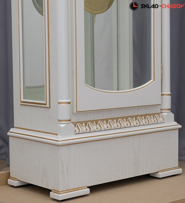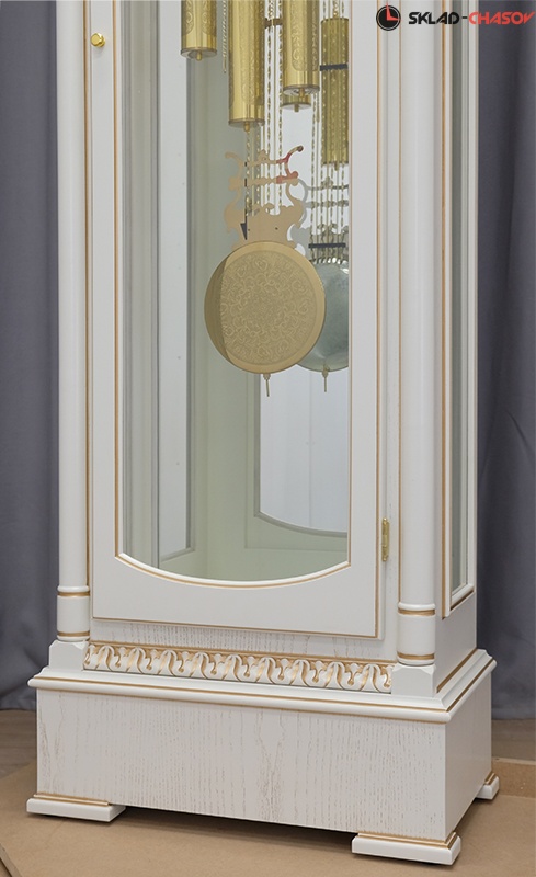 Позолоченный маятник и гири эффектно гармонируют с золотой патиной корпуса;
