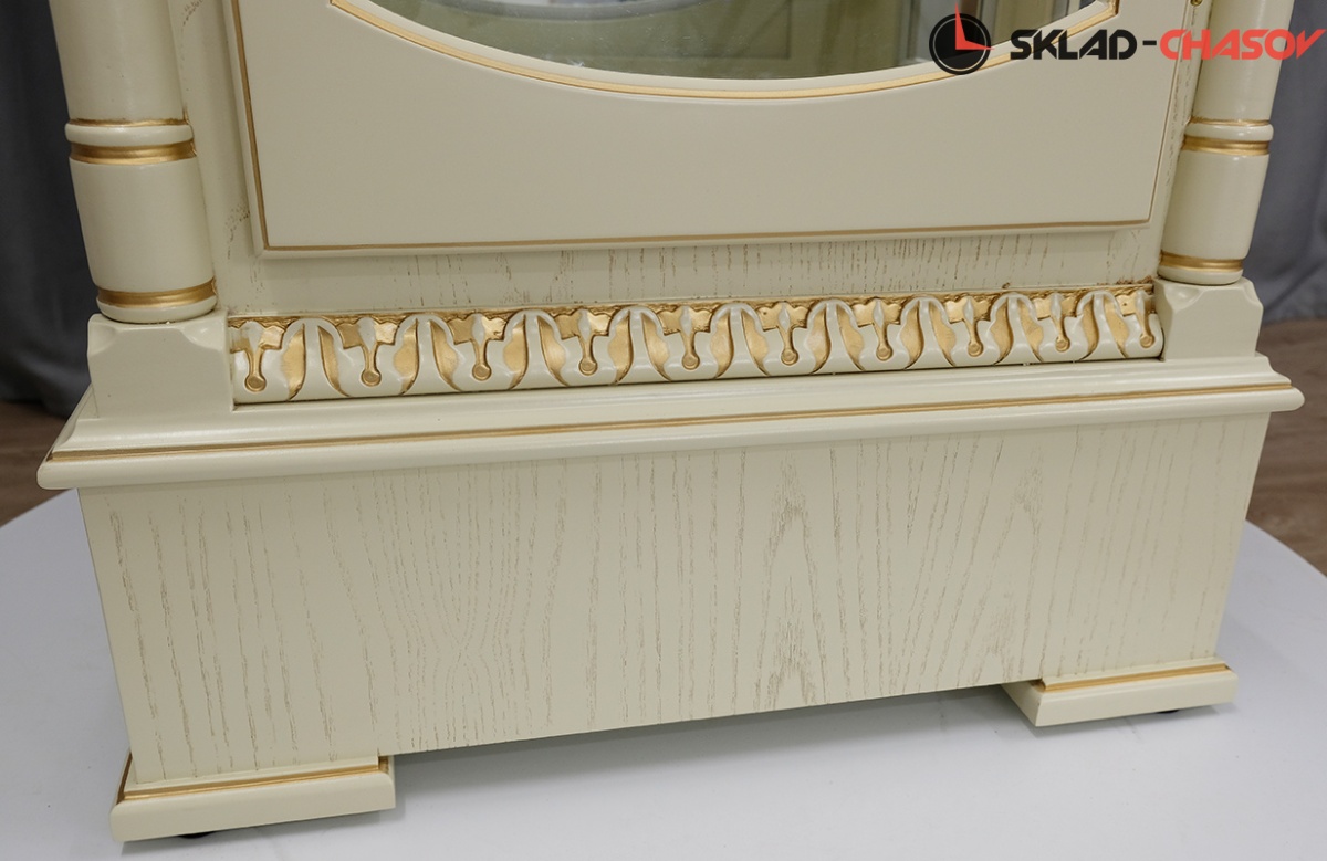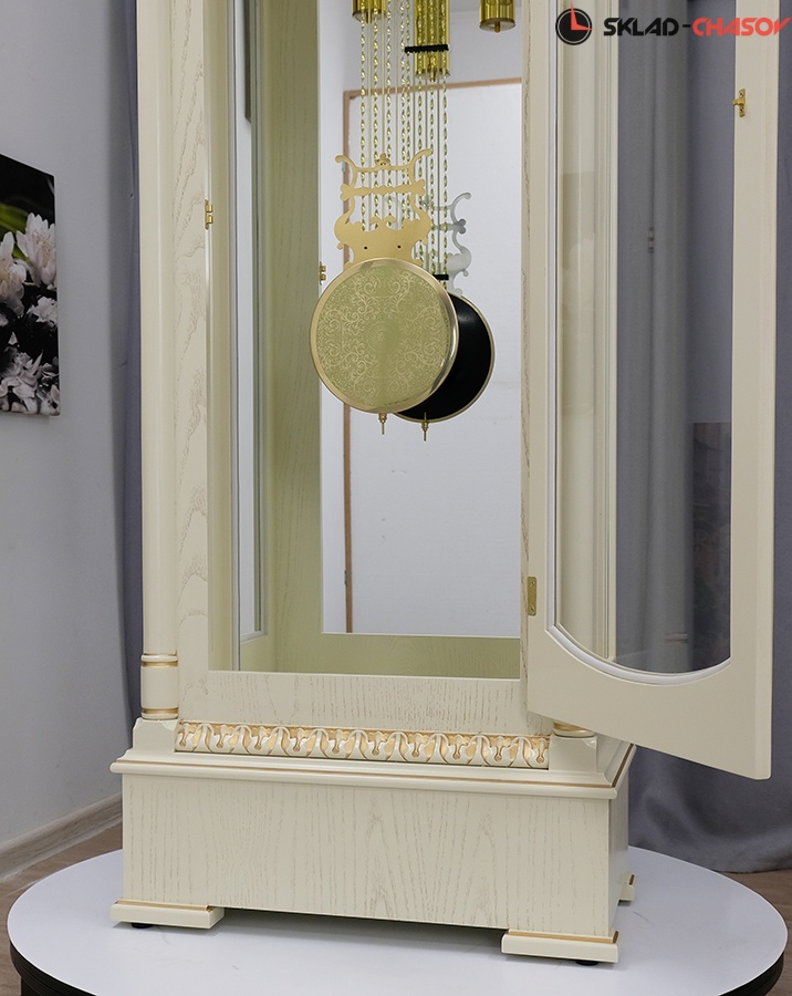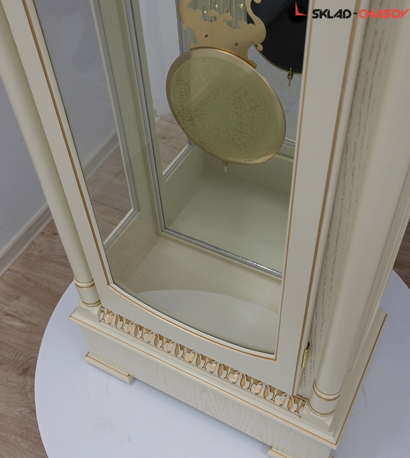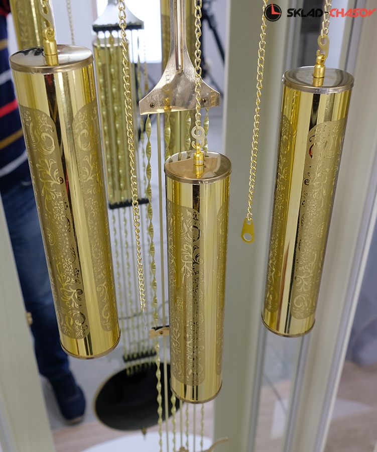 Позолоченный маятник и гири эффектно гармонируют с золотой патиной корпуса;