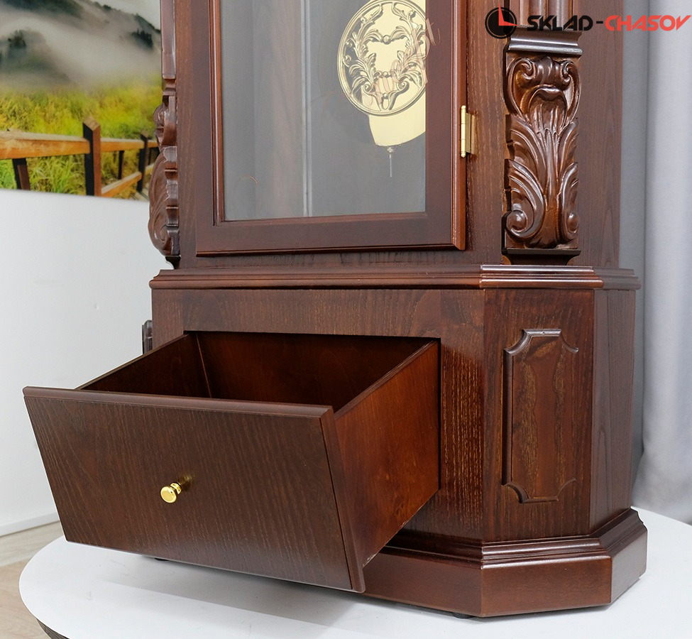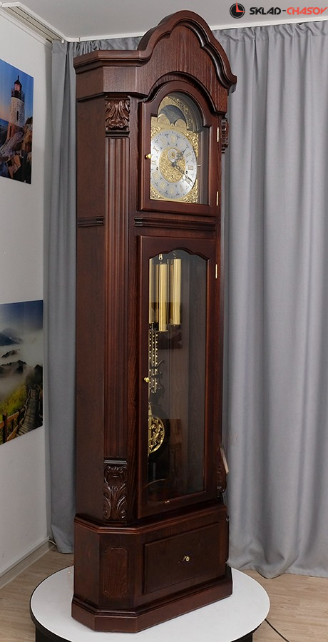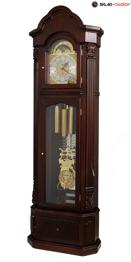 Тонирование корпуса напольных часов выполнено в цвете красное дерево.